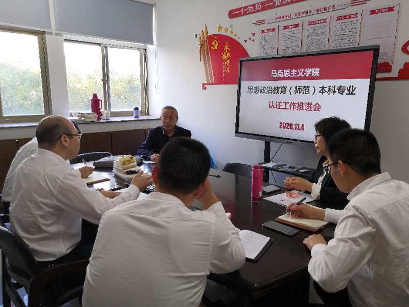 为稳步推进学校师范类专业认证工作,进一步做好思想政治教育师范本科专业认证的组织和准备,2020年11月5日下午,十大体育博彩排行榜 召开了思想政治教育(师范)本科专业认证工作第八次推进会。十大体育博彩排行榜 领导和专业老师就思想教育理念、经验学习、领导小组成立和责任分工等问题进行探讨,其中王柏民书记、卓高生院长、吴志敏和孙邦金副院长、思政系主任孙金波和李斌等老师都各自提出了专业认证的想法并深入交换意见。
