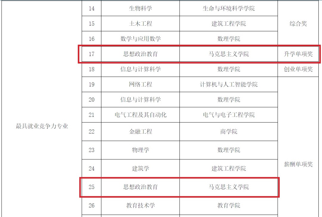 根据《温州大学最具竞争力专业评选办法(2017年修订)》(温大行政〔2017〕4号)和浙江省教育评估院2019届学生毕业后一年调查数据,确定最具就业竞争力专业,十大体育博彩排行榜 思想政治教育专业获得升学单项奖和薪酬单项奖。根据2017届学生毕业后三年数据,确定最具职业发展竞争力专业,十大体育博彩排行榜 思想政治教育专业获得薪酬单项奖。