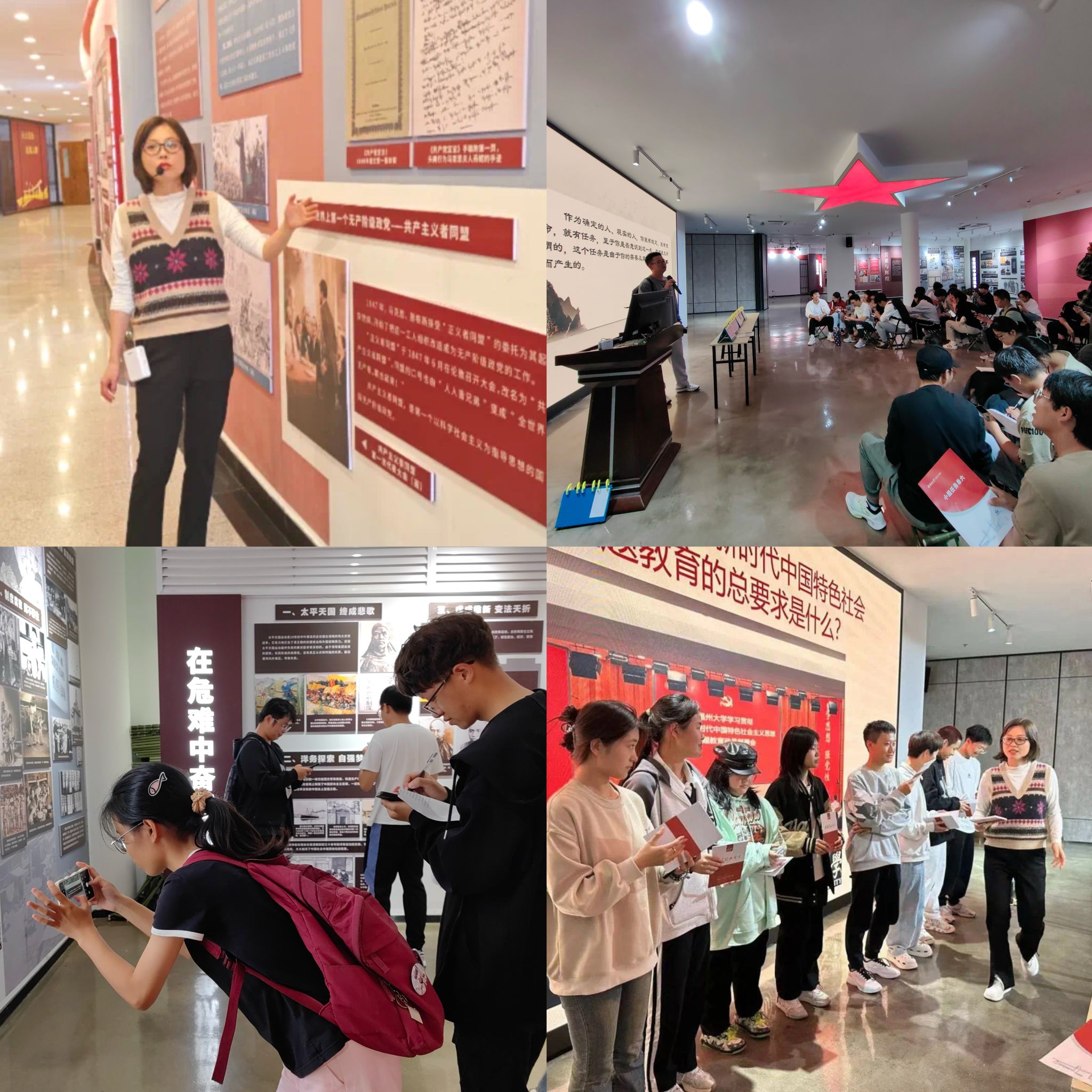 在马克思主义理论教育基地的现场教学中,老师引导学生参观基地内的各个展示区,详细讲解了“马克思主义的创立和发展”“中国共产党的初心和使命”等2个单元,通过“真理与信仰”“苦难与辉煌”“认同与自信”“梦想与奋斗”“奋进与复兴”等版块,同学们通过小组朗解读中国历史的苦难与辉煌、中国的梦想与奋斗等重要专题。诵、小组抢答、小组对抗赛、寻找红色记忆等环节,在互动合作、团队协同中增强了思政课的针对性和吸引力。
