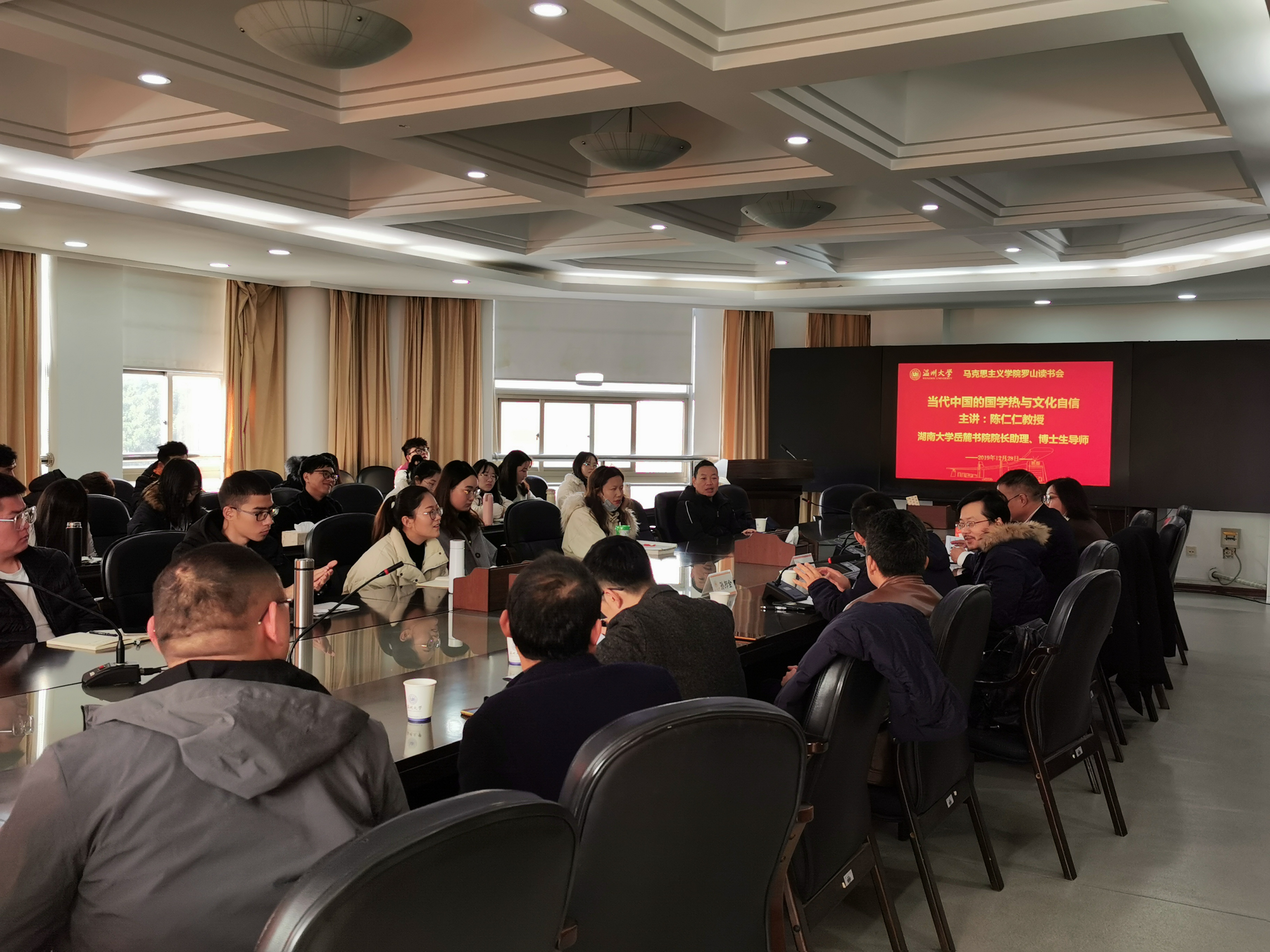 2019年12月28日上午,在十大体育博彩排行榜 在北校区行政楼227会议室举行了十大体育博彩排行榜 第28期罗山读书会活动。本次读书会邀请到了湖南大学岳麓书院院长助理、博士生导师陈仁仁教授做了题为《当代中国的国学热与文化自信》的报告。十大体育博彩排行榜 副院长孙邦金教授主持了此次读书会活动,有来自十大体育博彩排行榜 、人文十大体育博彩排行榜 部分教师和学生60余人与会交流。