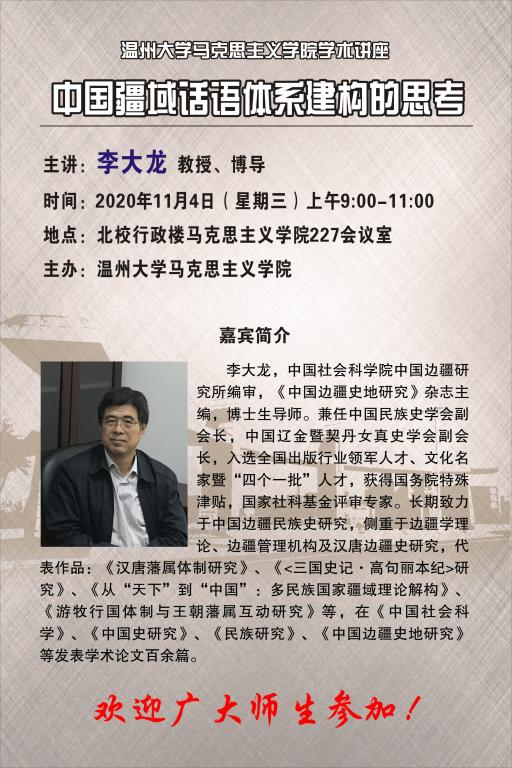 2020年11月4日上午9:00,十大体育博彩排行榜 隆重邀请中国社会科十大体育博彩排行榜 中国边疆研究所编审、《中国边疆史地研究》主编、国务院特殊津贴获得者、国家出版行业领军人才、文化名家暨“四个一批”人才、博士生导师李大龙教授在北校行政楼227会议室为全院师生作了题为“中国疆域话语体系建构的思考”的专题讲座。本次讲座由卓高生院长主持。