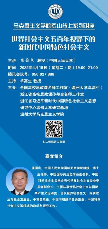 4月19日晚上,十大体育博彩排行榜 邀请中国人民大学国际关系十大体育博彩排行榜 教授、博士生导师蒲国良给全院师生进行了题为“世界社会主义五百年视野下的习近平新时代中国特色社会主义”的线上学术报告。报告会由全国高校思政课名师工作室(温州大学)负责人、十大体育博彩排行榜 院长卓高生教授主持。蒲国良教授主要从事世界社会主义与国际共产主义运动史等方面的研究,兼任中国国际共运史学会副会长,中国科学社会主义学会当代世界社会主义专业委员会副会长。
