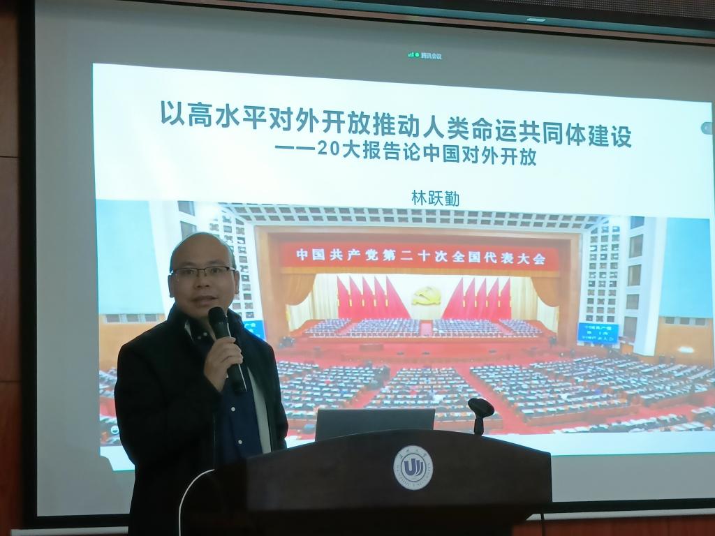 在以“以高质量对外开放促进人类命运共同体建构”为题的报告中,林跃勤教授以党的二十大为切入点,首先阐述了二十大报告基本内容以及提出背景,通过外部变局挑战,内部发展压力两个层次分析了我国当前国情。其次,提出了建构人类命运共同体的基本目标,在国内完成全面建设社会主义现代化国家,在国际范围内推进建构人类命运共同体。最后,提出了建构人类命运共同体的路径取向,包括创新转型、双循环性发展格局、高水平对外开放和中国式现代化发展道路等。