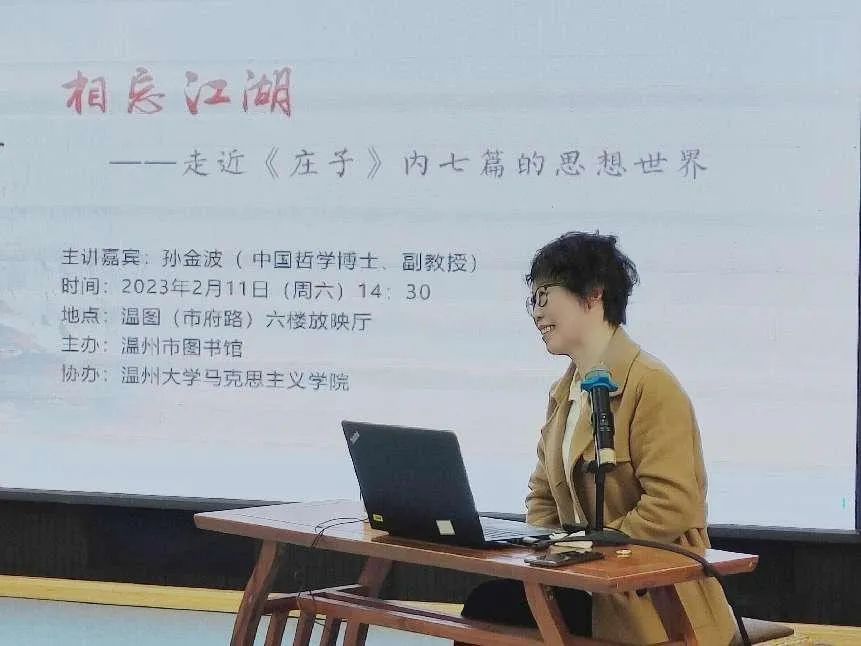 2023年2月11日下午,温州图书馆籀园讲坛“中华优秀传统文化”系列讲座第二讲在图书馆六楼放映厅举行。本次论坛主讲人为十大体育博彩排行榜 孙金波副教授,讲座主题为“相忘江湖——走近庄子内七篇的思想世界”。