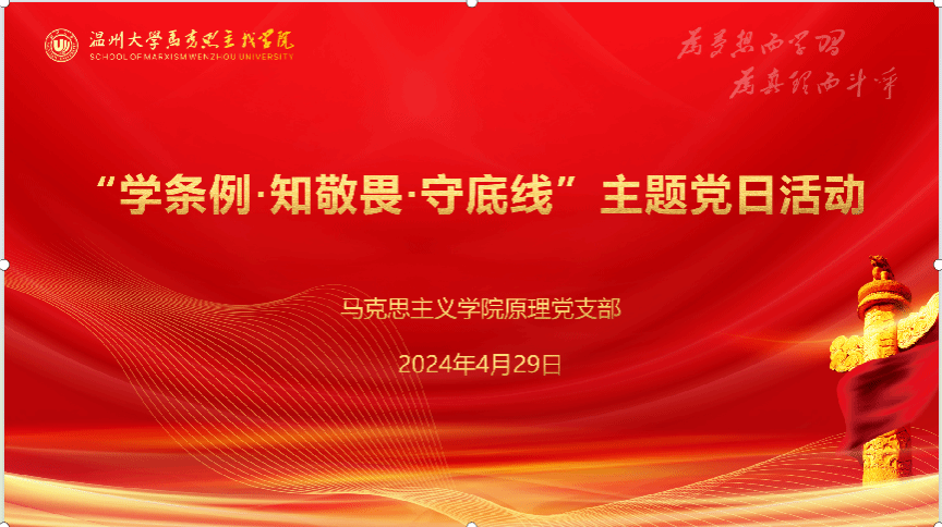原理党支部:4月29日晚,党支部开展“学条例·知敬畏·守底线”主题党日活动。支部党员教师认真学习新修订《条例》,深刻认识《条例》修订的重要意义,切实增强贯彻新修订《条例》的政治自觉、思想自觉、行动自觉,做到内化于心、外化于行。