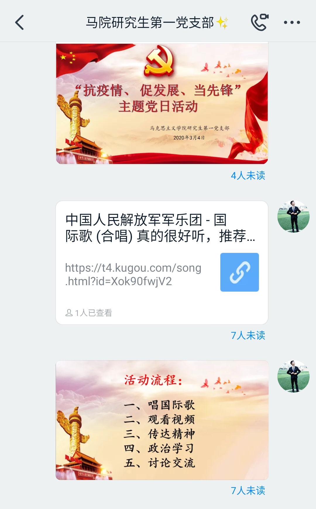 本次主题党日活动形式新颖、内容丰富、讨论激烈,充分展现出战“疫”时刻党员同志的良好精神风貌,积极落实“两手都要硬、两战都要赢”的重要精神,不获全胜决不轻言成功。作为即将从事思想政治工作的马克思主义理论学科的硕士毕业生,相信在校院领导和老师的关怀引导下,定以正确的政治立场、深厚的思想情怀、高尚的道德情操、扎实的理论功底投身教育行业,为培养能担当民族复兴大任的时代新人贡献自己的力量!
