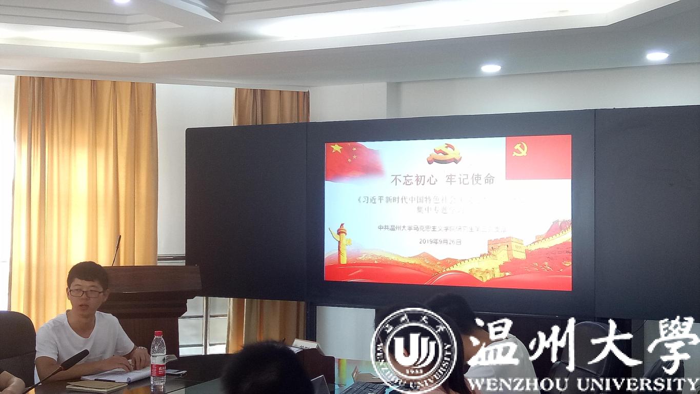 9月26日上午,在北行政楼227会议室,十大体育博彩排行榜 研究生第三党支部举行了“不忘初心,牢记使命”的集中专题学习。出席大会有全体学生党员和入党积极分子,会议由支部副书记张凯主持。