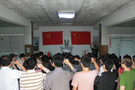 万全镇的新农村建设考察结束后,思政部师生一行怀着崇敬的心情来到了位于郑楼镇的叶廷鹏烈士纪念馆,一起缅怀我们的革命先烈,告慰烈士英灵。观看了纪念馆的图文资料,了解革命烈士的悲壮事迹后,全体师生都深受感动,感受中国革命的无私奉献精神,接受了一次生动的爱国主义教育。在思政部党总支书记任映红教授的领誓下,思政部全体党员面对党旗,重温入党誓词:“我志愿加入中国共产党,拥护党的纲领……”。