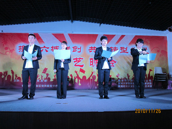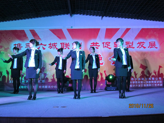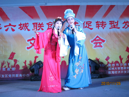 11月26日晚,由温州大学思政部和瓯海经济开发区党员服务中心主办的大型文艺晚会在温州市小林鞋材有限公司举行,来自温大思政部公民教育宣讲团和开发区德赛职工艺术团的演艺人员奉献了一台精彩的寓教于乐的文艺表演。