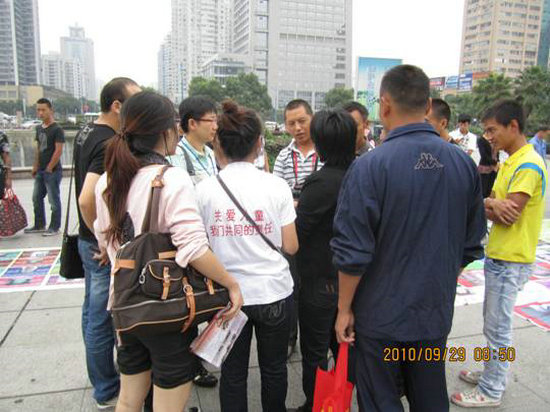 9月29日,一支由党员和入党积极分子组成的温州大学思政部研究生志愿者服务队在项淳芳和卓高生老师的带领下参加了宝贝回家志愿者协会和温州萤火虫义工团组织的“帮助冯爸爸全国寻女活动”。