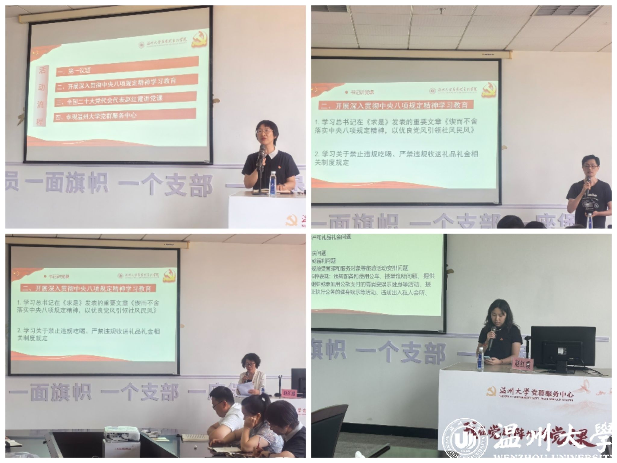 活动伊始,教工第一党支部书记项淳芳主持第一议题学习,带领党员们共同学习了《习近平关于加强党的作风建设论述摘编》(第七-九部分)、习近平总书记在纪念陈云同志诞辰120周年座谈会上的讲话。原理党支部书记骆徽领学总书记在《求是》发表的重要文章《锲而不舍落实中央八项规定精神,以优良党风引领社风民风》,思政党支部书记孙金波宣读关于禁止违规吃喝、严禁违规收送礼品礼金相关制度规定,行政党支部书记黄雪莹以高校领域违反中央八项规定精神典型案例对在场师生开展警示教育。