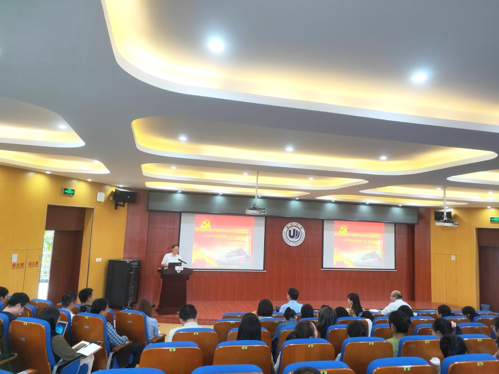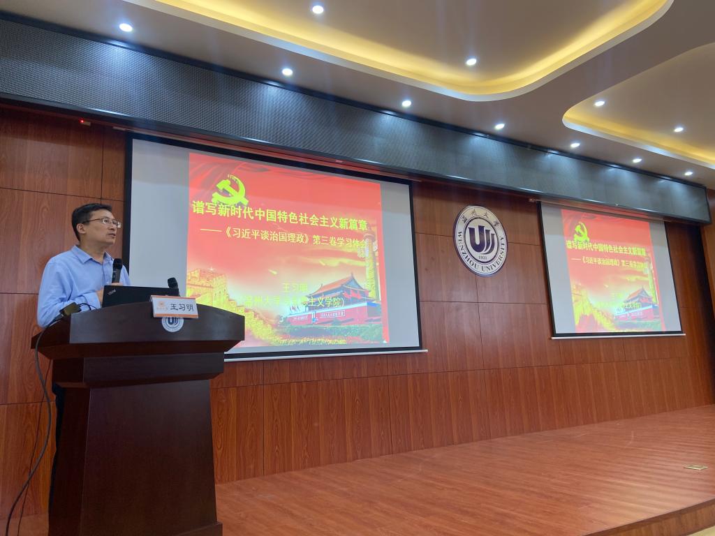2020年10月14日下午,十大体育博彩排行榜 联合国际教育十大体育博彩排行榜 举办了一场生动的理论学习会。本次政治理论学习会邀请了十大体育博彩排行榜 全国百千万人才才、有突出贡献中青年专家王习明教授作《谱写新时代中国特色社会主义新篇章——<习近平谈治国理政>第三卷学习体会》的专题报告。会议由十大体育博彩排行榜 党委书记王柏民主持,十大体育博彩排行榜 全体教师、学生党员、国际教育十大体育博彩排行榜 全体党员教师参加会议。