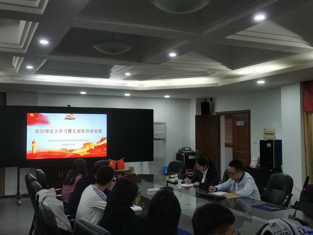 为了深入贯彻十九届五中全会精神,十大体育博彩排行榜 研究生第三党支部11月4日晚在北校行政楼227会议室召开政治理论学习会暨党员讲党课活动。研究生第三党支部全体党员参加学习会,学习会由党支部副书记张凯主持。