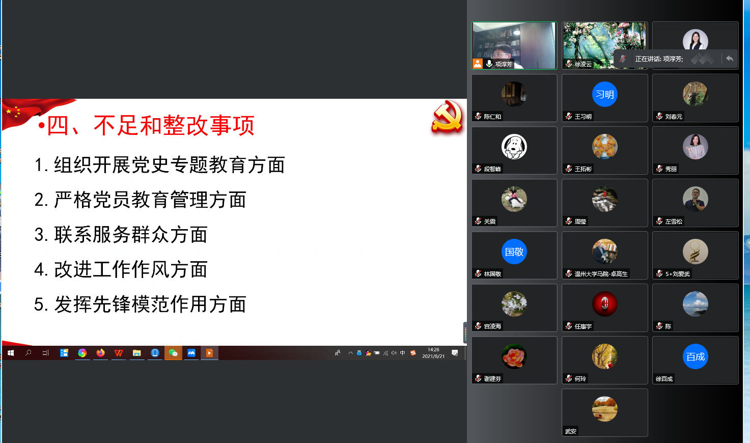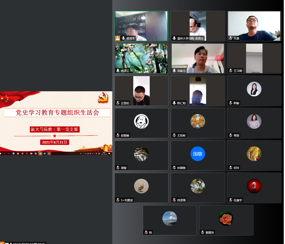 为贯彻落实市、校党史学习教育领导小组办公室部署和十大体育博彩排行榜 关于召开党史学习教育专题组织生活会方案的精神,8月21日下午,十大体育博彩排行榜 教工第一党支部围绕“学党史、悟思想、办实事、开新局”的主题,组织全体党员通过腾讯会议召开线上党史教育专题组织生活会。会议由党支部书记项淳芳同志主持,十大体育博彩排行榜 院长兼党委副书记卓高生同志以普通党员身份参加党支部和概论党小组的专题组织生活会。