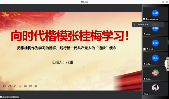 视频学习结束后,支部进行了传统特色主题活动——支部党员讲党课。首先由花甜同志带来微党课《向时代楷模张桂梅学习》。其内容讲述了“七一勋章”获得者张桂梅同志的生平与感人事迹,张桂梅同志把别人眼中的不可能变为现实,自2008年建成全国第一所公办免费女子高中以来,这12年间,她让1804名女孩考入大学,走出高山,实现了“让大山女孩有书读”的梦想。作为青年党员,我们要像榜样致敬、向榜样学习!