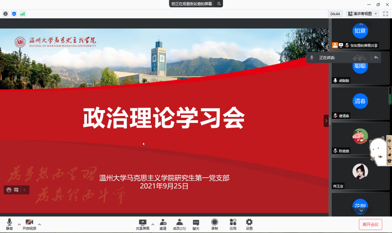 9月25日晚,十大体育博彩排行榜 研究生第一党支部于线上召开政治理论学习会,全体党员参与会议,会议由党支部副书记张如意主持。