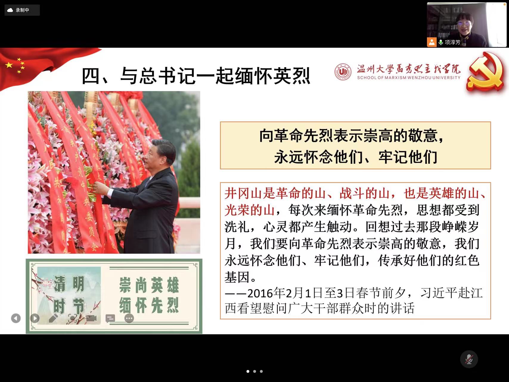 网祭忠魂,丰碑永恒。活动前,48位师生党员事先关注“温州市革命烈士纪念馆”公众号进行学习。活动中,由教工第一党支部书记项淳芳老师分享《人民英雄纪念碑》MV,接着带领师生在线上“云观展”温州革命烈士纪念馆VR展厅,并在线参与由纪念馆工作人员代献花圈活动,通过“云祭扫”进入翠微山烈士陵园祭拜革命英烈。师生党员深受感动,纷纷登录“温州革命烈士纪念馆”线上平台,怀着崇敬的心情通过网上鲜花、祭拜留言和转发分享“H5”等形式,“云接力”为英雄献花,表达对革命英烈的缅怀之意。然后项淳芳老师与师生共同学习习近平总书记关于英雄烈士的系列讲话,与习近平总书记一起缅怀英烈,致敬人民心中“最闪亮的坐标”。
