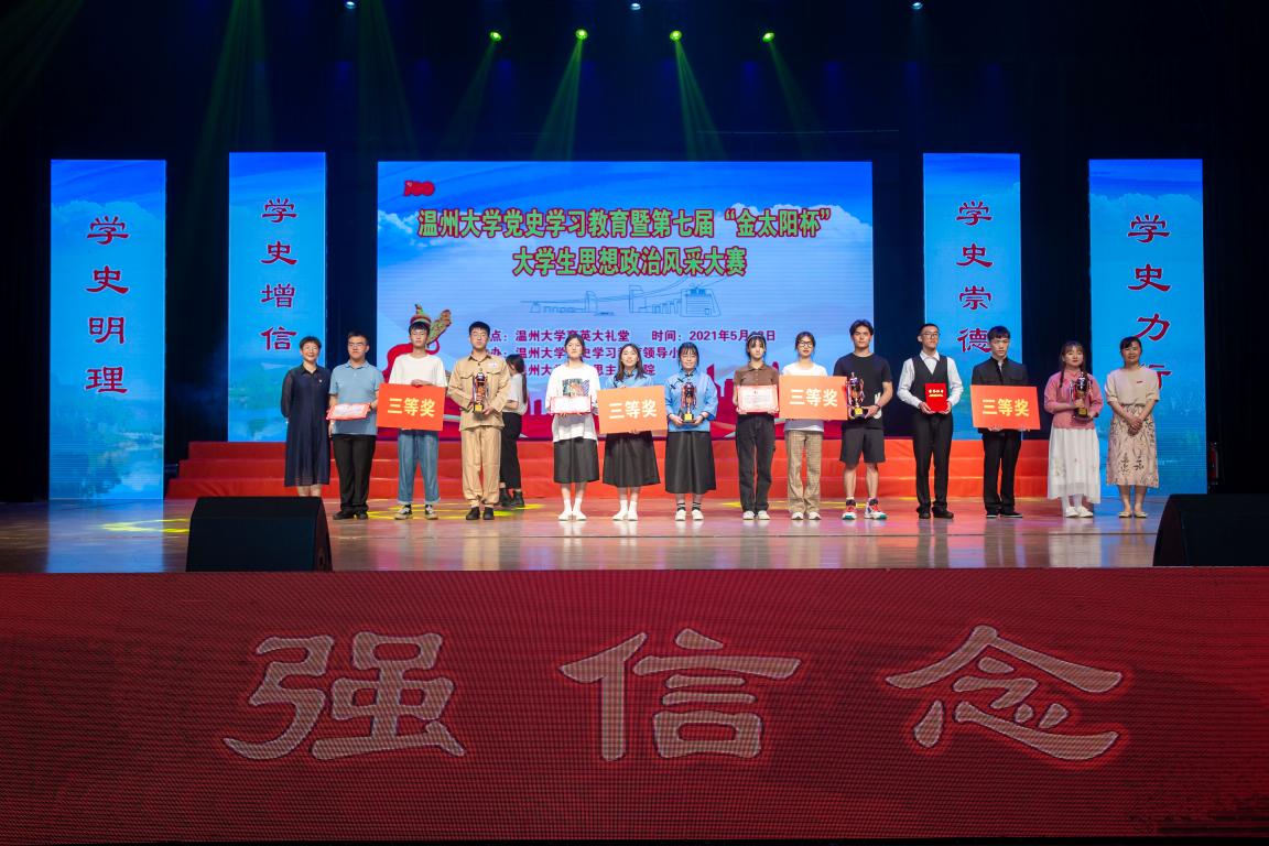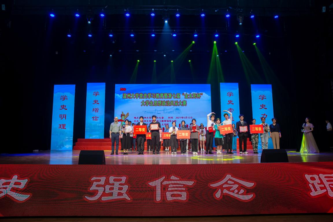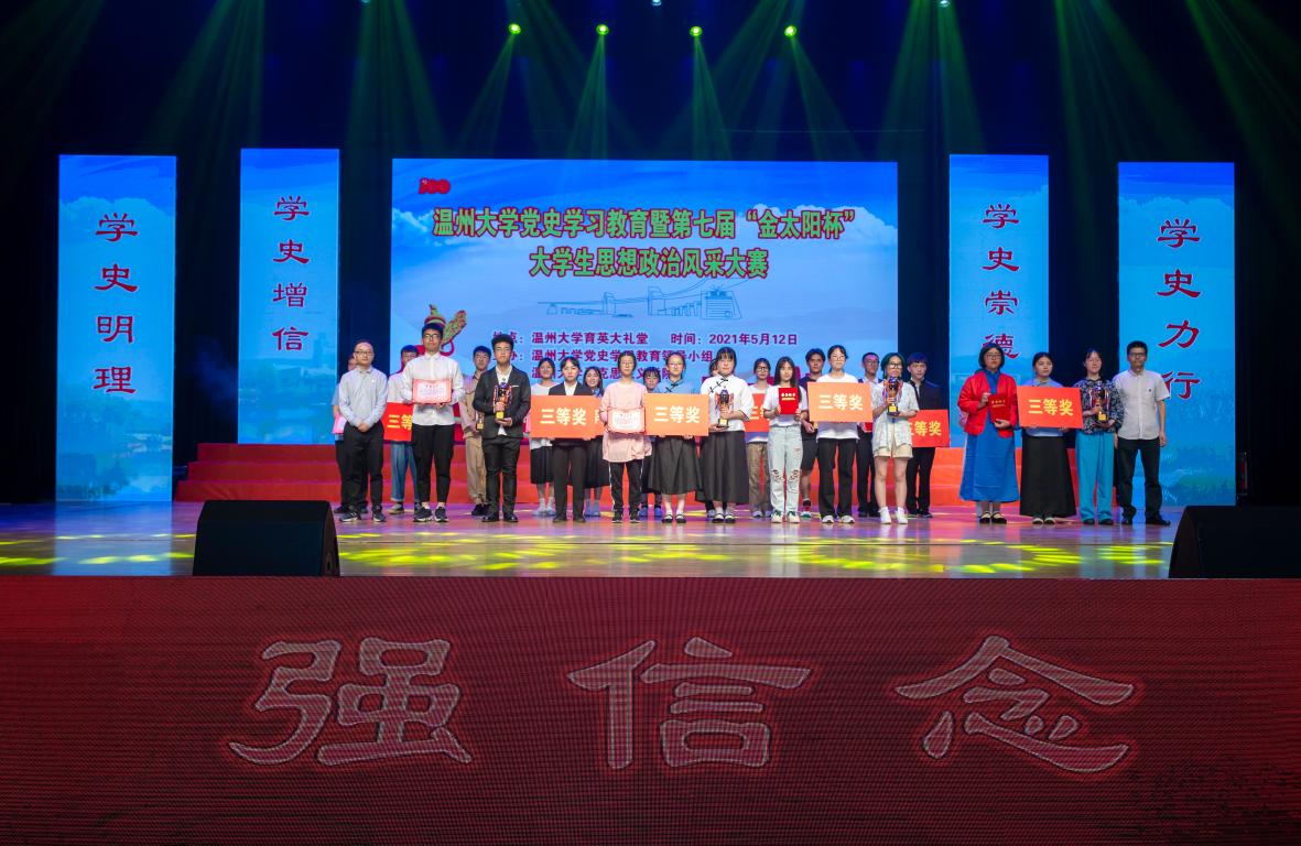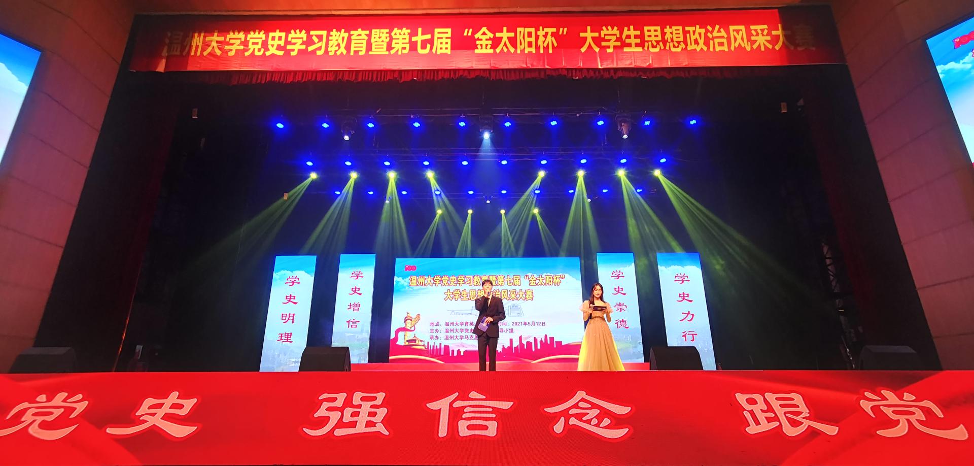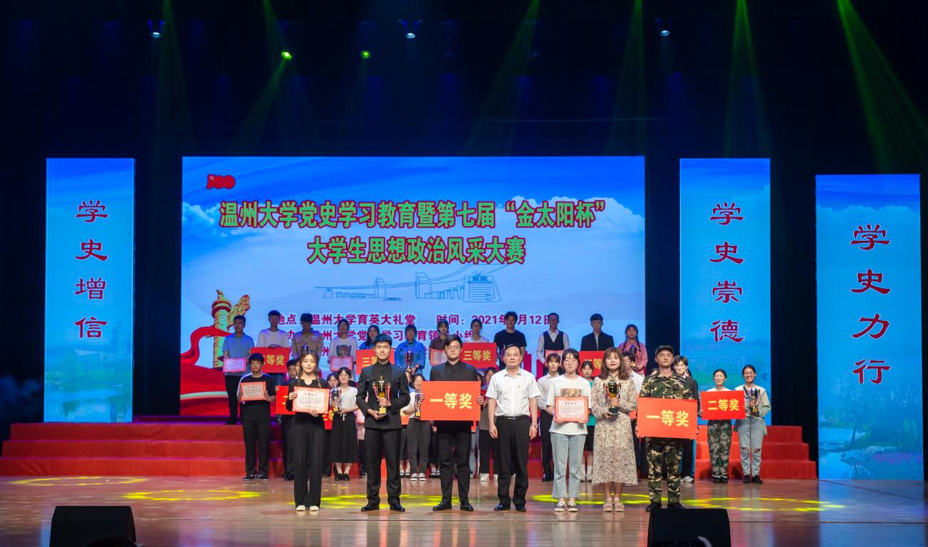 百年征程波澜壮阔,百年初心历久弥坚。5月12日下午,温州大学党史学习教育暨第七届“金太阳杯”大学生思想政治风采大赛在育英大礼堂隆重举行。本次大赛由温州大学党史学习教育领导小组主办,十大体育博彩排行榜 承办。校党委委员、宣传部长潘玉驹,教务处副处长陈小林,校团委副书记丁强,十大体育博彩排行榜 院长卓高生、党委书记王柏民、副院长吴志敏莅临现场全程观摩并为获奖队伍颁奖,全校1000多位师生参加此次活动。本次活动还开通网上直播,截止目前已有超过8000人次在线观看。