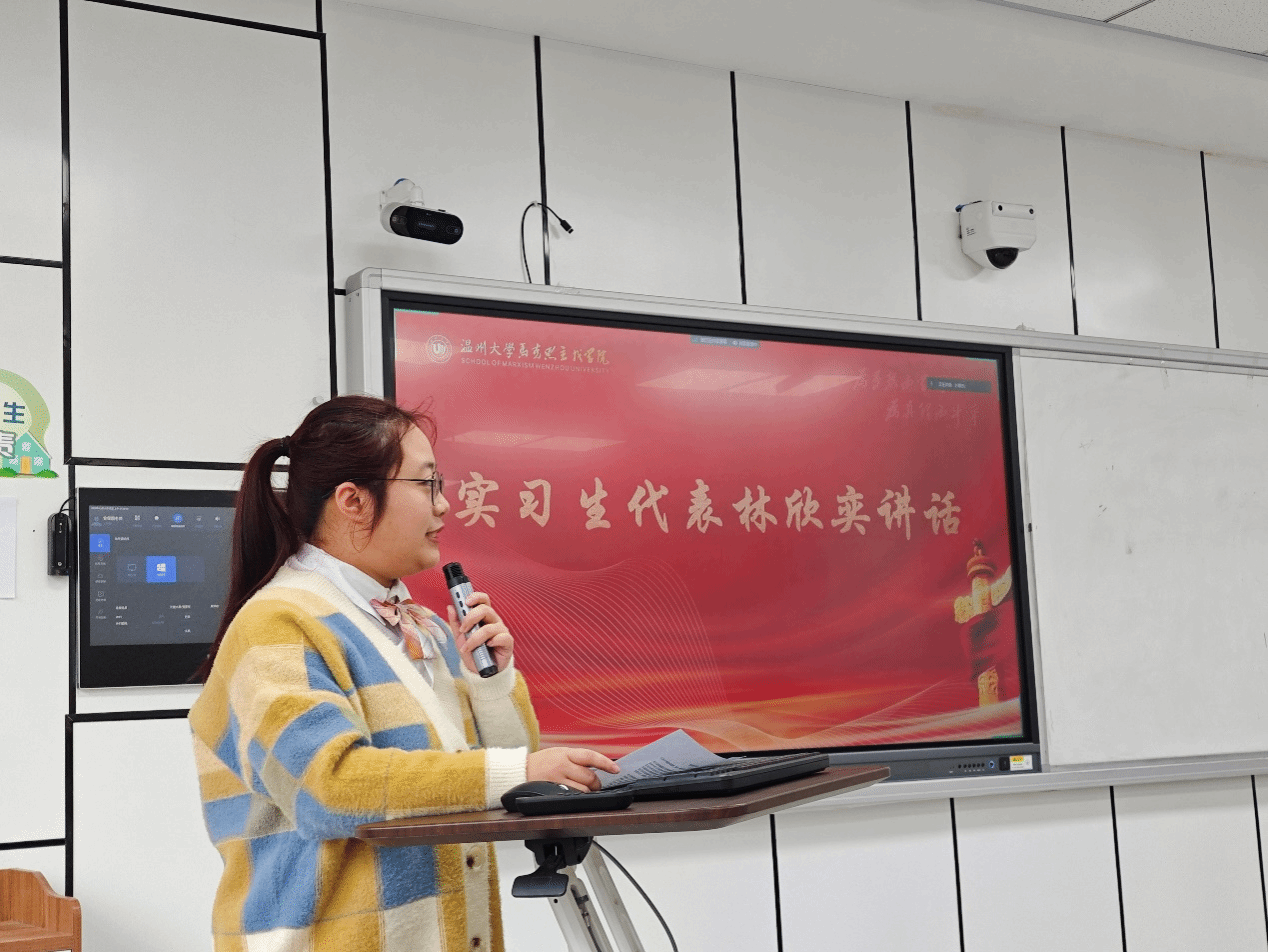21政教1班林欣奕同学代表即将出发实习生们发言。她首先对组织这次实习工作老师们表达了感谢。其次,她讲到“成为一名师范生,是教育的信念支撑着我们不断前行、不断探索,我们想以微弱的光,照亮学生前行的一程路。”最后,她表达了要出色完成本次实习任务的决心。
