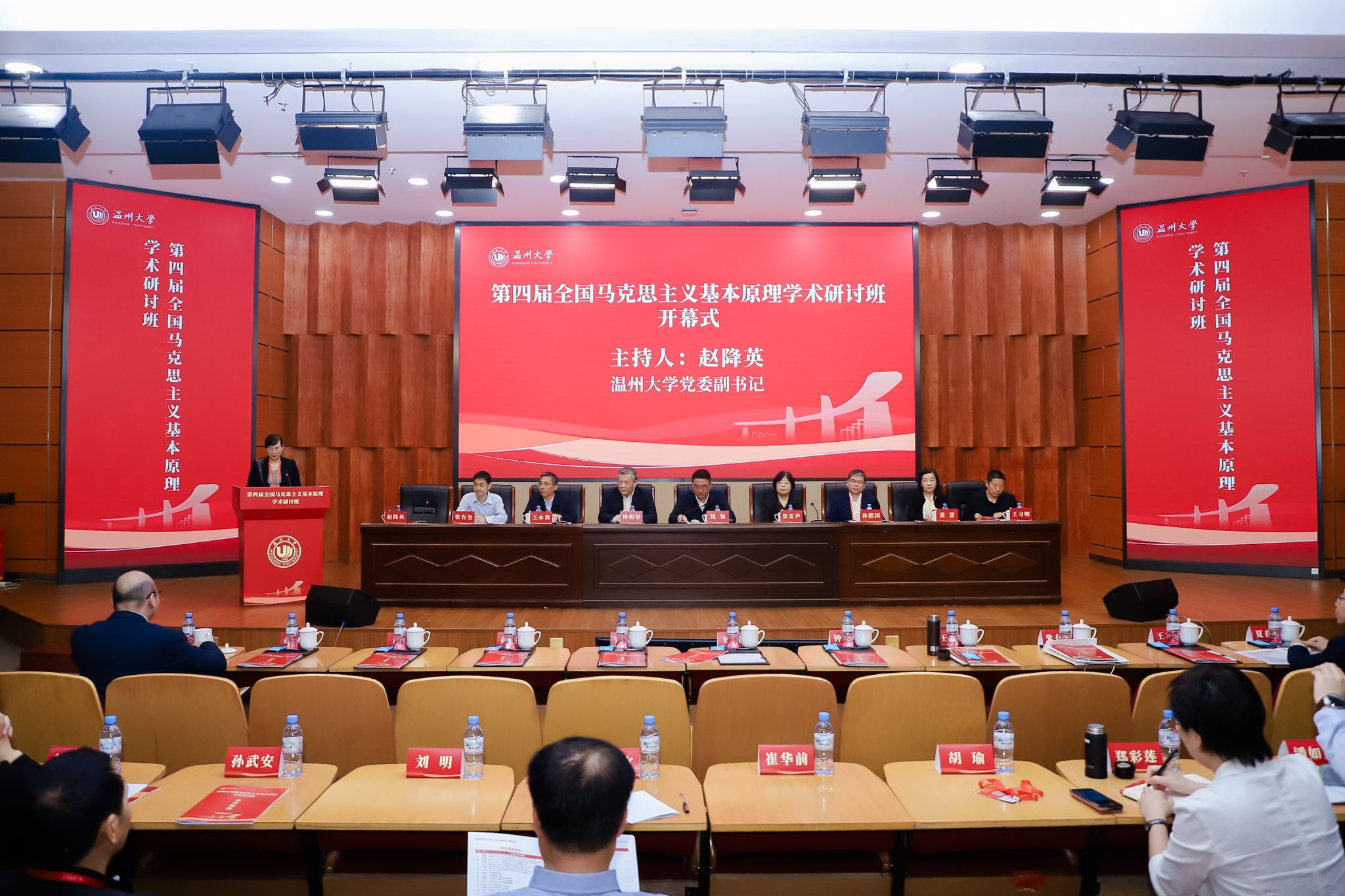 27日上午,学术研讨班举行开幕式。全国高校马克思主义理论研究会副会长、中国人民大学教授张雷声、温州大学党委书记钱强出席开幕式并讲话。全国高校马克思主义理论学科研究会副会长、中山大学十大体育博彩排行榜 钟明华教授,北京大学习近平新时代中国特色社会主义思想研究院常务副院长孙熙国教授,教育部“长江学者”特聘教授、南京师范大学十大体育博彩排行榜 王永贵教授,教育部高校思政课“原理”分教指委副主任委员、北京师范大学十大体育博彩排行榜 熊晓琳教授,教育部青年长江学者、华中科技大学十大体育博彩排行榜 董慧教授,教育部高校思政课“原理”分教指委委员、厦门大学十大体育博彩排行榜 常务副院长张有奎教授,国家百千万人才和有突出贡献中青年专家、十大体育博彩排行榜 王习明教授在主席台就坐。开幕式由温州大学党委副书记赵降英主持。