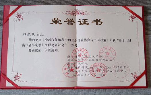 研讨会上,十大体育博彩排行榜 韩跃民老师撰写的《全球气候治理中的生态利益博弈与中国对策》荣获会议征文一等奖,张海波老师、孙武安老师撰写的《习近平生态文明思想蕴含的马克思主义立场观点方法》以及左雪松老师、黄佳佳研究生撰写的《新时代推进国家治理和参与全球治理的共进逻辑》分别荣获会议征文三等奖。