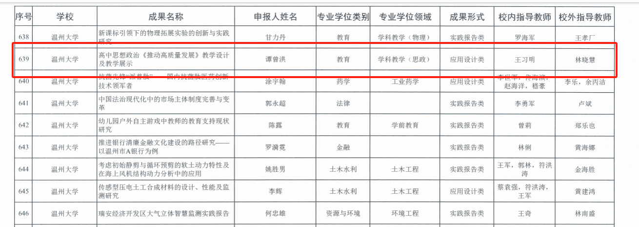 近日,浙江省研究生教育学会公布了2024年浙江省优秀研究生教学案例认定结果以及2023年浙江省专业学位研究生优秀实践成果评选结果。十大体育博彩排行榜 2022级学科教学(思政)专业研究生谭曾洪的“高中思想政治《推动高质量发展》教学设计及教学展示”成功入选2023年浙江省专业学位研究生优秀实践成果。