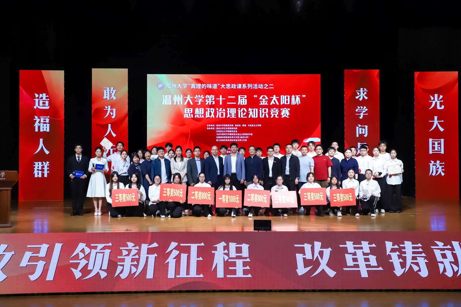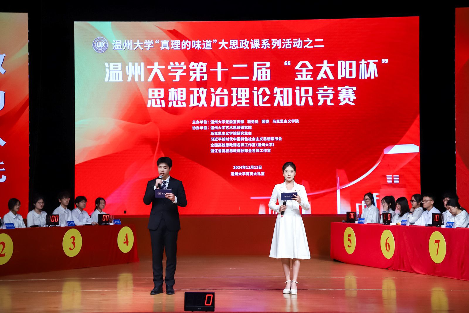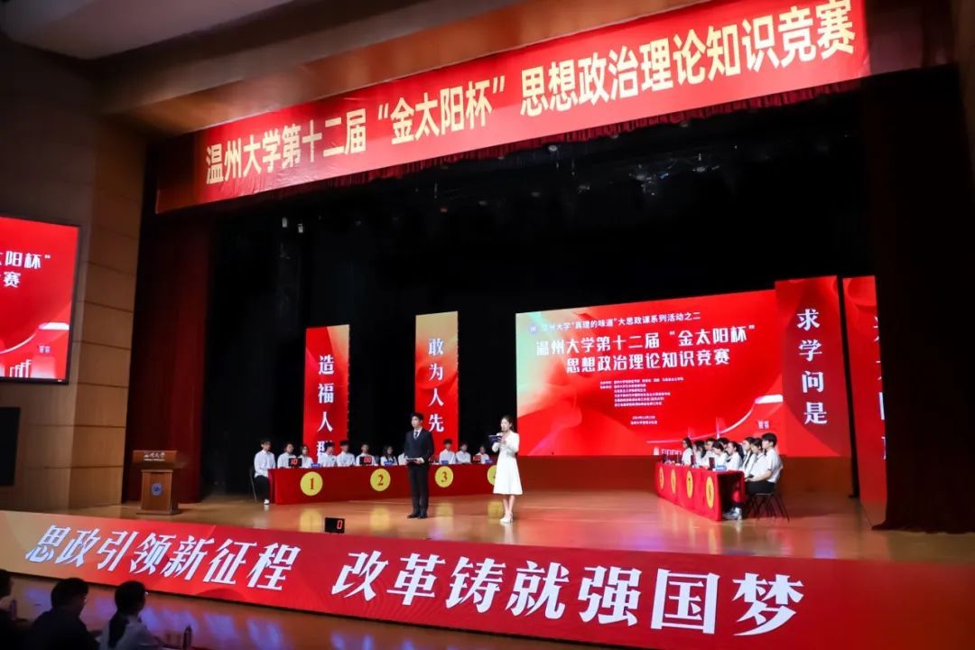 为进一步贯彻落实习近平总书记关于新时代思政课建设的重要指示精神,坚持用党的创新理论推动思政课建设高质量发展,深入推动党的二十届三中全会精神“进教材、进课堂、进头脑”,引领广大师生提高政治理论素养,2024年11月13日下午,温州大学“真理的味道”大思政课系列活动之二——第12届“金太阳杯”思想政治理论知识竞赛决赛在温州大学育英大礼堂隆重举行。