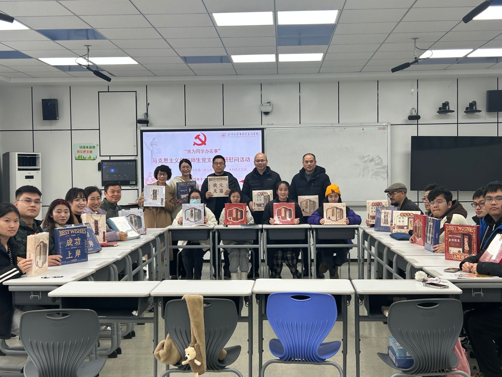 寒冬融暖意,温情润人心。在考研的冲刺阶段,为增强考研学生备考信心,鼓舞备考斗志,十大体育博彩排行榜 思政党支部、研究生第二党支部、本科生党支部于12月11日上午在北4-204教室联合举办了一场主题为“我为同学办实事”的考研慰问座谈会。出席座谈会的有:院长卓高生老师、党委书记杨立淮老师、副院长孙邦金老师、副院长何玲老师、思政系主任孙金波老师、思政系梁家荣老师、方德志老师、班主任代表关震老师、辅导员黄澜老师,部分25届考研学子代表出席本次活动。慰问座谈会由十大体育博彩排行榜 党委副书记吴冬冬老师主持。