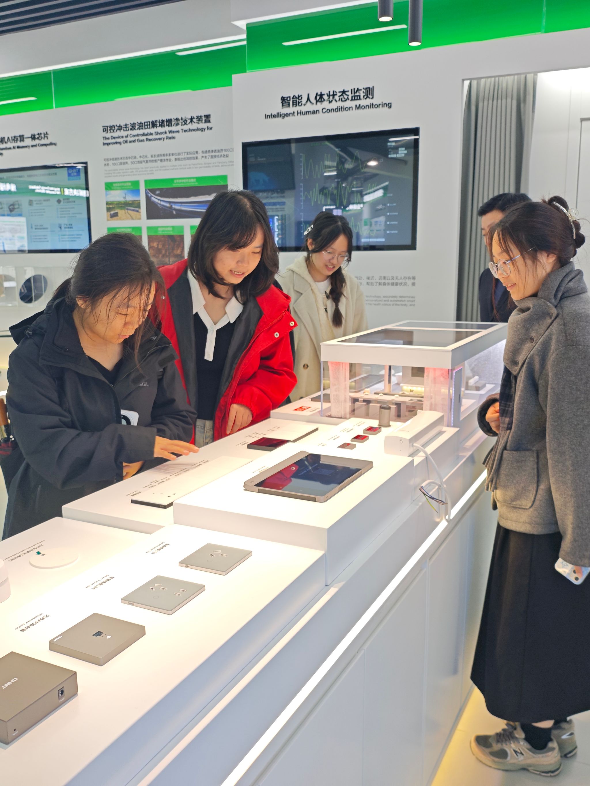 首先,同学们来到展厅。这里记录着正泰集团四十年来创业创新发展历程以及成果。讲解员为我们介绍近年来正泰集团持续推进“产业化、科技化、国际化、数字化、平台化”战略部署,形成了“绿色能源、智能电气、智慧低碳”三大板块和“正泰国际、科创孵化”两大平台。正泰集团广泛应用高端数控、智能化生产线、智能物流和智能检测等现代化产线装备建设“未来工厂”,积极响应国家号召,建设“国家级绿色工厂”,始终将构建完善的企业社会责任管理体系,持续改进和提升社会责任绩效贯穿于企业经营的各个环节,为国家经济发展注入民企活力。