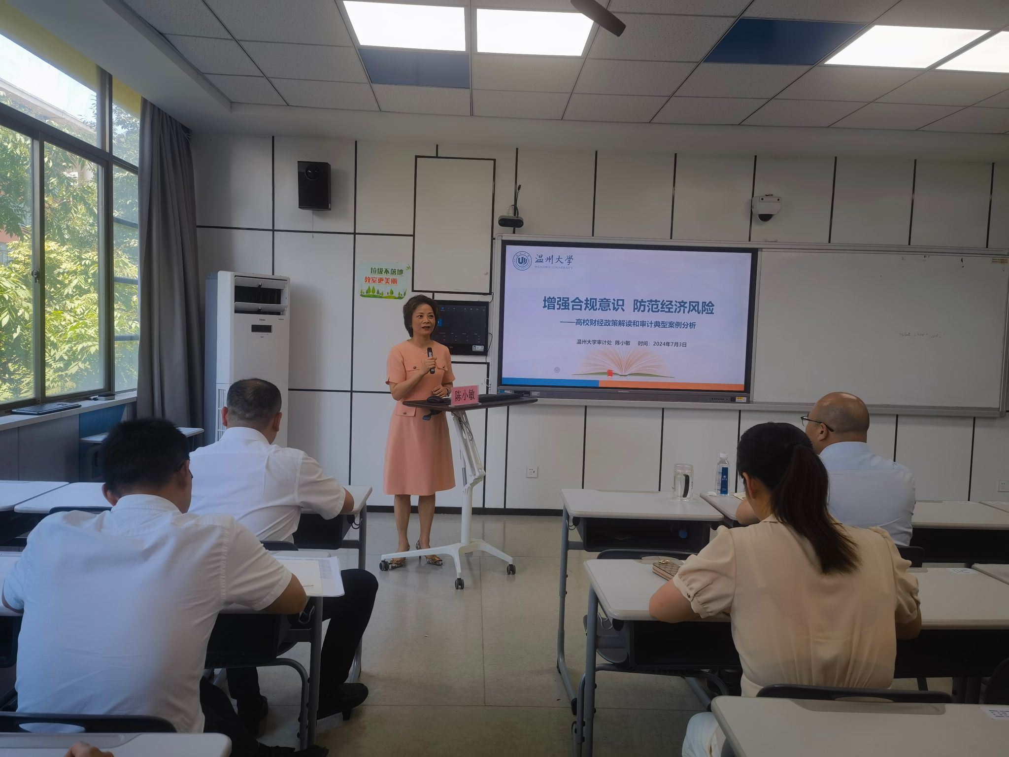 2024 年 7 月 3 日,十大体育博彩排行榜 举行警示教育专题学习活动,邀请审计处陈小敏处长作《增强合规意识 防范经济风险 —— 高校财经政策解读和审计典型案例分析》报告,全院教职工参会。会议由十大体育博彩排行榜 党委书记杨立淮主持。