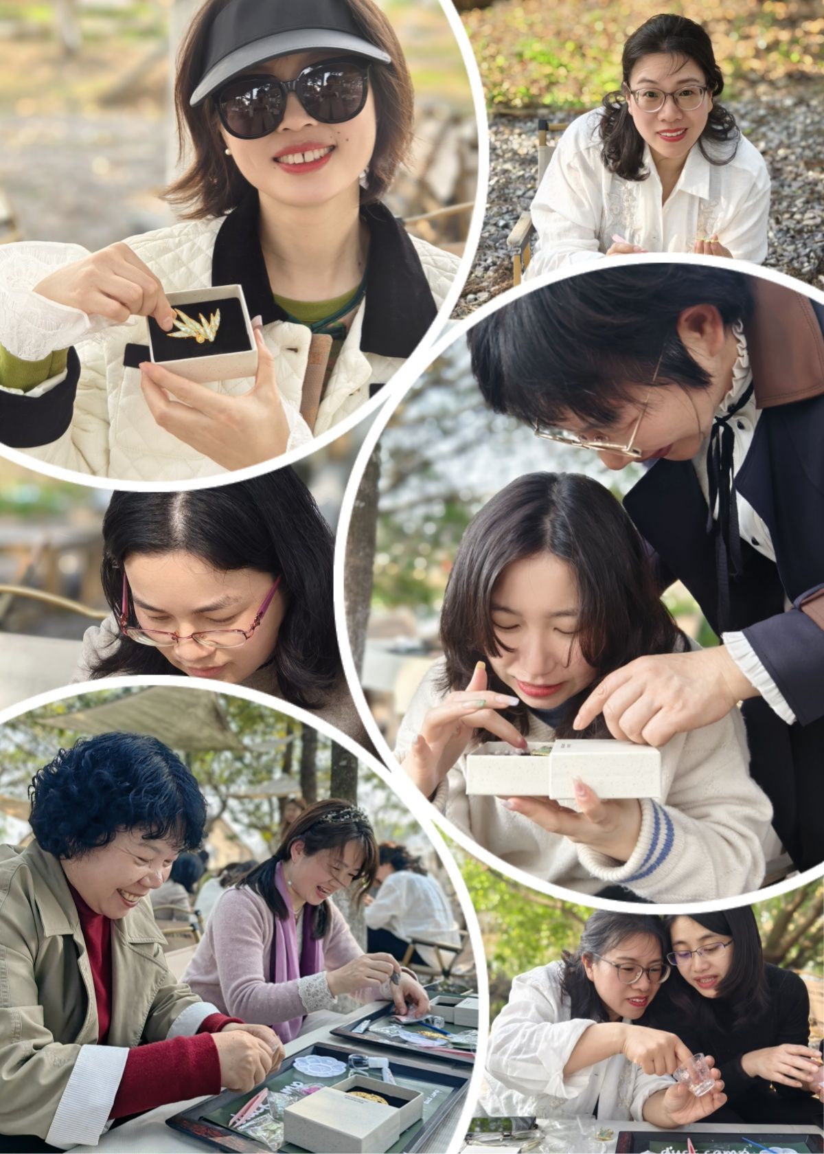 用餐后,活动迎来了手工创作环节——制作钿螺胸针。钿螺,作为一种承载着深厚文化意义和审美价值的传统手工艺品,深受人们喜爱。本次活动特别提供了竹子和蝴蝶两种图案的模具,分别象征着坚韧与高洁。在工作人员的悉心指导下,女教职工们兴致勃勃地挑选颜色,精心雕刻,每一件作品都融入了她们的智慧与创意,彰显了个人的独特魅力。不久,一系列精致、色彩缤纷的钿螺成品呈现在众人面前,不仅美化了现场,也成为了每个人专属的纪念品。活动的高潮环节是体验开蚌取珍珠。在大家的热切期待中,普通的河蚌缓缓揭开其神秘的面纱,瞬间,那些璀璨夺目、色彩斑斓的珍珠展露无遗,赢得了在场所有人的热烈掌声。这不仅是一次对自然界奇迹的探索,也是一次对生活美好寓意的深刻领悟。