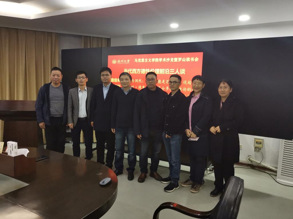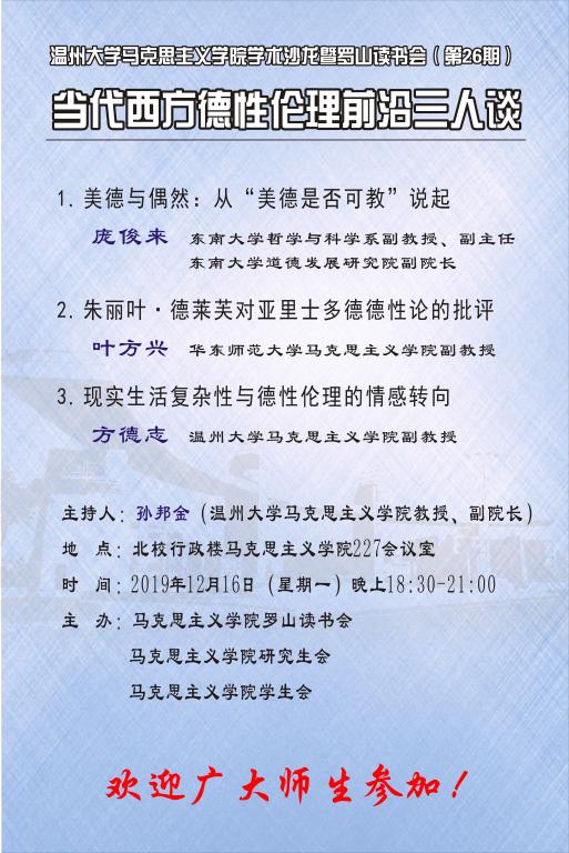 2019年12月16日,十大体育博彩排行榜 在北校区行政楼227会议室开展了主题为“当代西方德性伦理前沿三人谈”学术沙龙暨读书会活动。东南大学人文十大体育博彩排行榜 哲学与科学系庞俊来副教授、华东师范大学十大体育博彩排行榜 叶方兴副教授以及十大体育博彩排行榜 方德志副教授结合各自的研学所得,分别做了题为《美德与偶然:从“美德是否可教”说起》、《朱丽叶·德莱芙对亚里士多德德性论的批判》、《现实生活复杂性和德性伦理的情感转向》的发言,十大体育博彩排行榜 副院长孙邦金教授主持此期读书会活动,十大体育博彩排行榜 研究生、本科生和部分老师参加了此次活动。