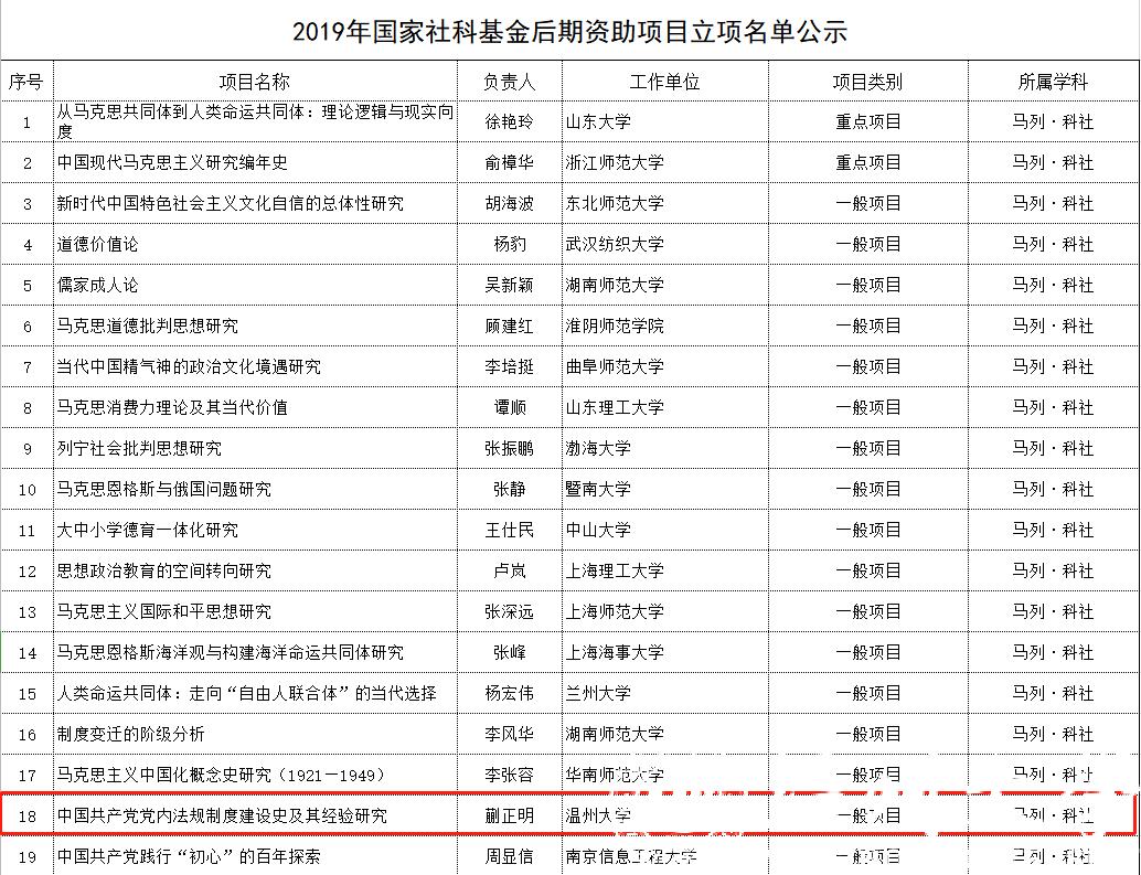 近日,2019年国家社科基金后期资助项目立项名单公示,十大体育博彩排行榜 蒯正明博士的《中国共产党党内法规制度建设史及其经验研究》喜获立项,这是他个人获得的第3个国家社科基金后期资助项目。