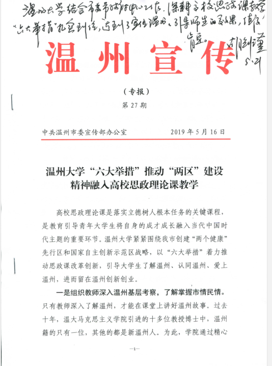 由温州市委宣传部5月16日印发的第27期《温州宣传》专题报道了《温州大学“六大举措”推动“两区”建设精神融入高校思政理论课教学》,介绍了温大体育博彩围绕温州“两区”建设中心工作,在思政课教学及教师科研、社会服务中积极开展系列活动的情况。体育博彩的做法受到了中共温州市委常委、宣传部长胡剑谨的批示肯定和温州大学党委书记谢树华的点赞。胡剑谨部长批示说:“温州大学结合市委市政府中心工作,深耕高校思政课教学,‘六大举措’扎实到位,达到了宣传温州、引导师生的效果,值得肯定。”谢树华书记点赞说:“体育博彩既说又做,赞一个。”领导的肯定点赞给了体育博彩教师们莫大的鼓励和鞭策。