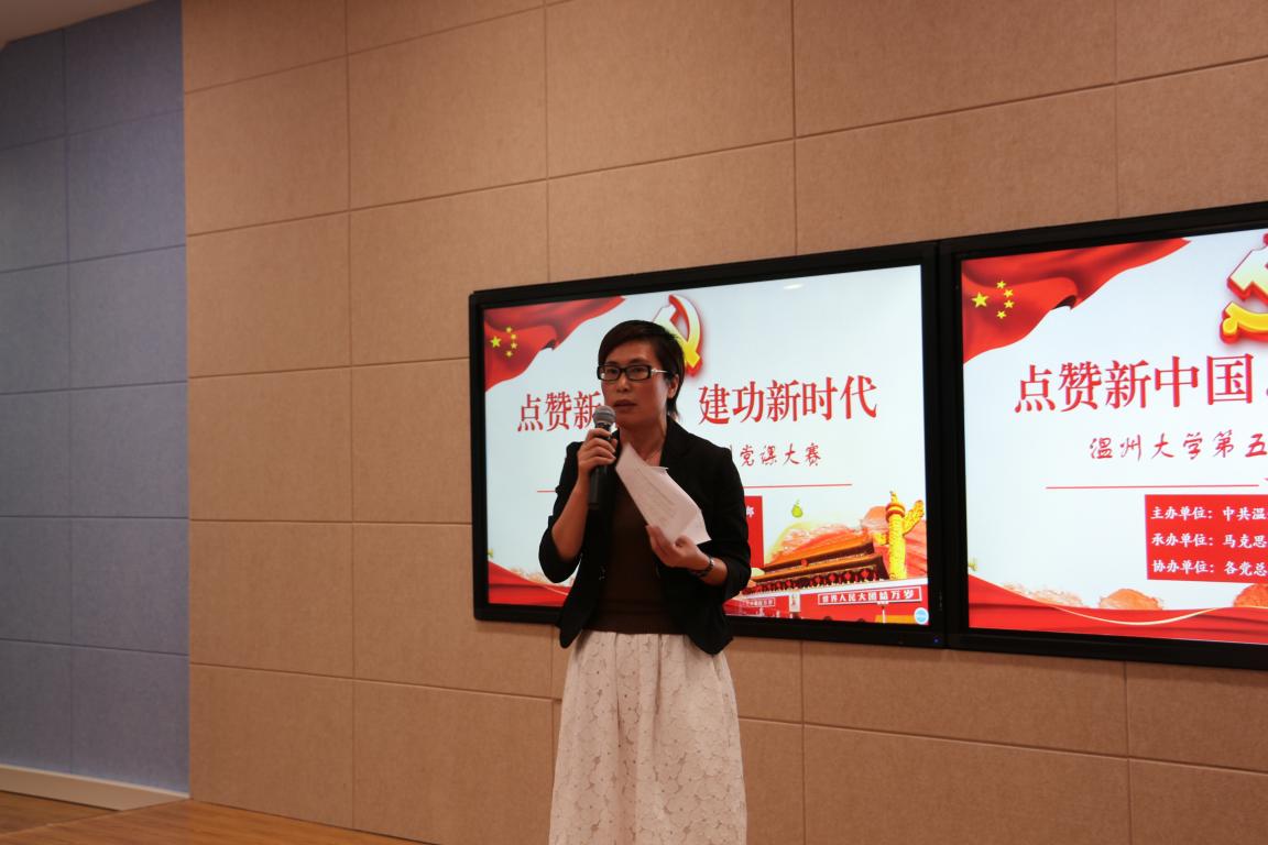 5月7日晚,温州大学第五届微党课大赛教师专场在南校岩松堂叶适厅举行。此次微党课大赛的主题是“点赞新中国,建功新时代”,由温州大学党委组织部主办、十大体育博彩排行榜 党总支承办、各党总支(分党委)协办。温州大学商十大体育博彩排行榜 党总支书记郑彩莲、教师教育十大体育博彩排行榜 党委书记杨立淮、温州大学党委宣传部副部长冯方盛、体育博彩党总支书记王柏民以及温州大学党委组织部组织科科长王晓华担任本次比赛评委。