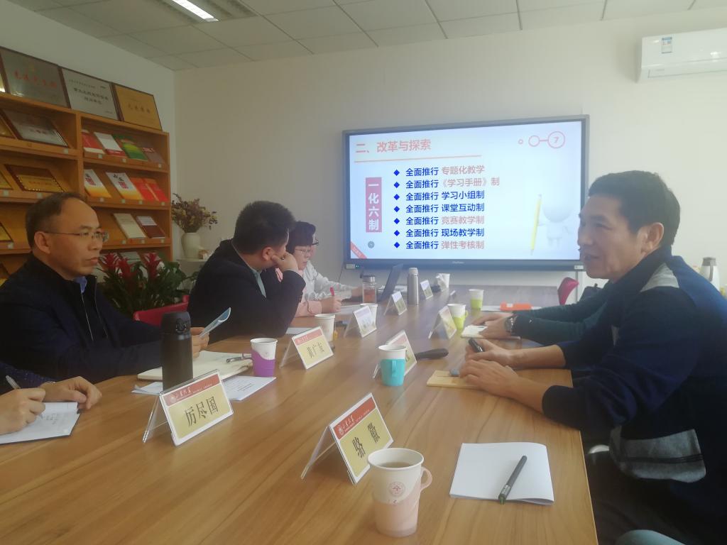 山大体育博彩院长王韶兴、党委书记马晓琳等热情接待了调研组,并就博士点建设、思政课建设、人才培养、平台建设、教工党支部党建建设等情况进行了深入探讨。王韶兴院长首先欢迎温大体育博彩一行,并介绍十大体育博彩排行榜 的总体情况。山大体育博彩是全国第一批重点体育博彩建设单位,目前还需要完成教育部跨省共建单位--宁夏医科大学的建设任务,在非公企业党建、人才培养、师资提升、科研学科、博点建设方面有学习、有支持、有互补。在教学实践方面,山大体育博彩要求全体教师全员备听,对课件好、学生喜欢听的课程进行奖励,以“三个更加”理念促进教学成果提升,即教师更加投入、教研室更加重视、十大体育博彩排行榜 更加支持。王院长也介绍了山大体育博彩在硕博教育方面的工作、以建立智库、非公党建研究所等为社会服务的工作经验,并提出山大体育博彩可以在实践教学、非公党建等方面与温大体育博彩合作研究。山大体育博彩党委书记马晓琳介绍了马克思主义中国化教研室党支部成为全国样板党支部的历程和做法,马书记介绍的让党建与业务双融合,让每次的党支部会议成为一次教研室研讨会,让每次教研室的备课会成为一次党课的理念赢得了在场温大老师的认可,他们表示此做法非常好,回来要好好学习实践。