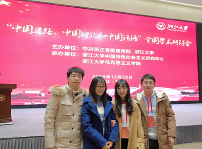 2018年12月29日,由中共浙江省委宣传部主办,中国特色社会主义研究中心、浙江大学十大体育博彩排行榜 承办的“中国道路、中国理论、中国话语”全国学术研讨会日前在浙江大学求是大讲堂召开。十大体育博彩排行榜 四位学生(杭琪、杨瑞平、陈俊儒、刘修发)携文参加本次研讨会。研讨会研讨会分为开幕式、两场主题报告和闭幕式三项议程。