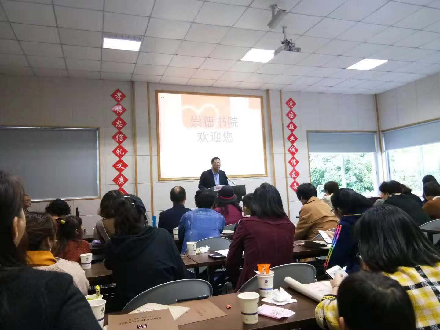 崇德书院是由瑞安市政协、市纪委、市委宣传部、组织部、党校等16家单位共同发起公创民办的公益性质的道德品行培训机构。书院以“学思悟践”为院训,以“弘扬中华优秀传统文化、做有道德品行的人”为宗旨,以“行孝、扬善、厚德、循道”为内容,以“言传、身教、境化、力行”为方式,自2013年12月5日开办以来,先后举办道德培训班402期,来自瑞安本地的党政机关干部、企事业单位职工、社区康复(戒毒)与矫正人员以及来自温州其他县(市、区)、丽水、绍兴等地及黑龙江、河南、江西、青海、台湾等省份的人员共计29197人参加了培训。书院对所有参训人员实行免费提供培训、资料和食宿,其运行也主要依靠一支规模较大的崇德互助义工(志愿者)团队的志愿服务。这支志愿队伍不但开展书院道德培训班,还推出了一系列以“崇德”为名的慈爱站、诚善农场、文工团、和合之家、共享基金等活动项目,在社会上产生了广泛的积极影响,2016年1月被温州市委组织部和市委党校确定为干部优秀传统文化与从政道德“现场教学示范基地”,2016年12月被浙江省人民政府授予第五届浙江省慈善奖,入选浙江省宣传思想文化工作“三贴近”优秀案例。上午10点,我们这一期培训活动在雄壮的国歌声开启。在观看几个介绍性视频以后,崇德书院创办人、瑞安市委党校原常务副校长郑超豪同志亲自为大家介绍了崇德书院的创办以及活动开展情况,并结合实际事例进行了弘扬中华优秀传统美德的道德宣讲。