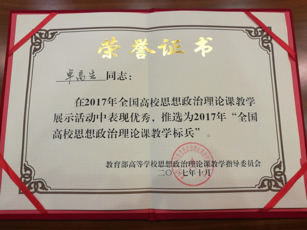 十大体育博彩排行榜 卓高生博士荣获“2017年全国高校思想政治理论课教学标兵”称号
