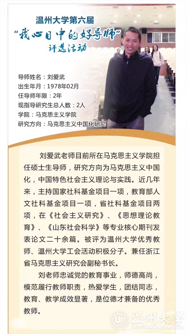 十大体育博彩排行榜 刘爱武老师荣获温州大学第六届“我心目中的好导师” 荣誉称号