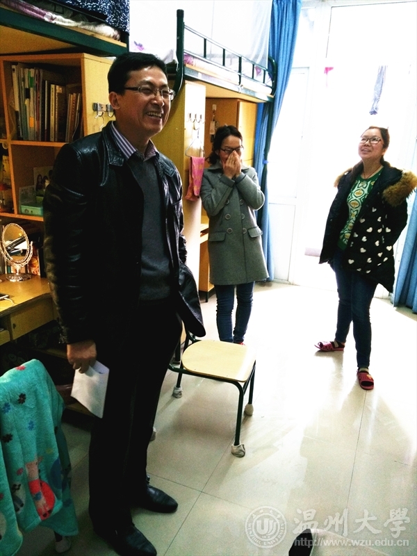 党总支书记王柏民在综合科科长曾蓓蕾老师的陪同下走进学生寝室,对寒假留宿学生表示慰问。