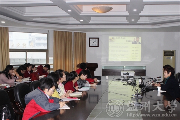 张小燕教授长期从事中国现代史、中共党史、毛泽东思想概论和毛泽东思想邓小平理论三个代表重要思想教学与研究工作。 张教授首先以十八大报告中“推进文化强国建设”的内容、习近平总书记谈文化建设和温州历史文化现象等引出文化核心即“合”、文化符号、文化个性等内容。随后,张教授以社会政治热点问题为序揭开社会文化建设的重要意义。接着,她从“中共成立是合文化的政治成果”“革命胜利是合文化的军事成果”“温州模式是合文化的经济成果”三个方面详细讲解了“和合”文化及其政治、军事、经济成果。张教授的报告融入了大量文史材料、温州地方文化现象,同时引用了大量的数据和鲜活的事例,内容丰富、见解独到,具有很强的实用性和创造性,且讲解深入浅出,赢得了同学们的一致好评。