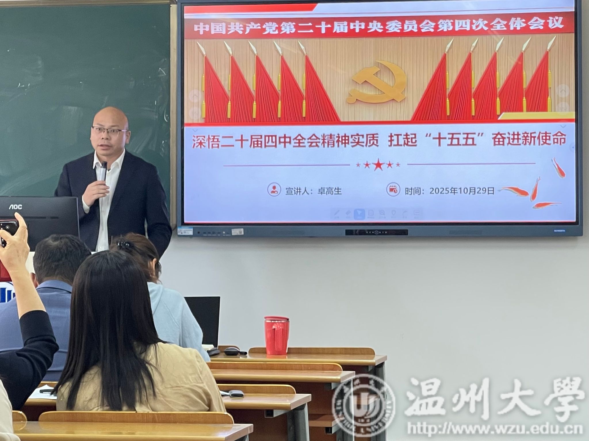 最后,卓高生院长作党的二十届四中全会精神专题学习分享。他强调学习党的二十届四中全会精神是当前首要政治任务,需深刻领悟精神实质,把握中国式现代化进程关键阶段,将其融入教学、学科建设与科研,并加强相关课题、论文等科研成果产出。编制和实施国民经济和社会发展五年规划,是我们党治国理政的重要方式,制定“五年规划”彰显制度优势,从实行第一个“五年计划”到2025年“十四五”规划即将收官,一个又一个五年,诠释了不同时期中国经济社会发展的历史标识,创造了世所罕见的经济快速发展和社会长期稳定两大奇迹。未来五年,各位老师要按照“十五五”经济社会发展规划,积极将教育科研、人才培养、社会服务等方面工作与经济社会发展需求紧密结合,为做好十大体育博彩排行榜 “十四五”收官、“十五五”开局夯实人才根基、积蓄发展动能,以思想引领凝聚奋进力量。要将党的二十届四中全会精神学习贯彻、研究阐释纳入学科任务,探索推进马克思主义理论、中共党史党建学学科建设。