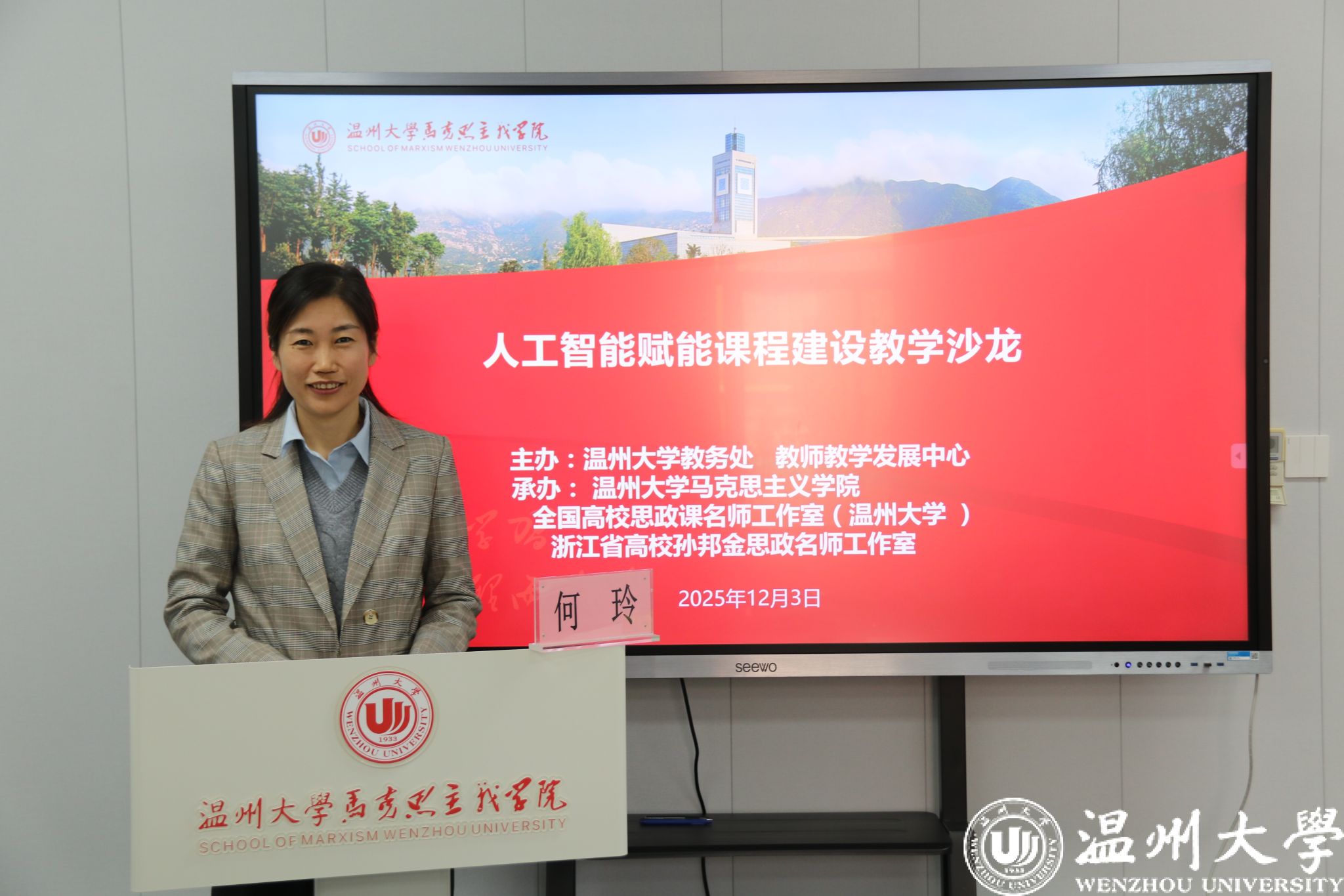 12月3日下午,由温州大学教务处、教师教学发展中心(教育督导与教学评估中心)主办,十大体育博彩排行榜 、全国高校思政课名师工作室(温州大学)和浙江省高校孙邦金思政名师工作室承办的“人工智能赋能课程建设”教学沙龙成功举行。本次沙龙汇聚跨学科专家智慧,旨在回应人工智能时代的教育变革,探索技术与教学深度融合的创新路径。
