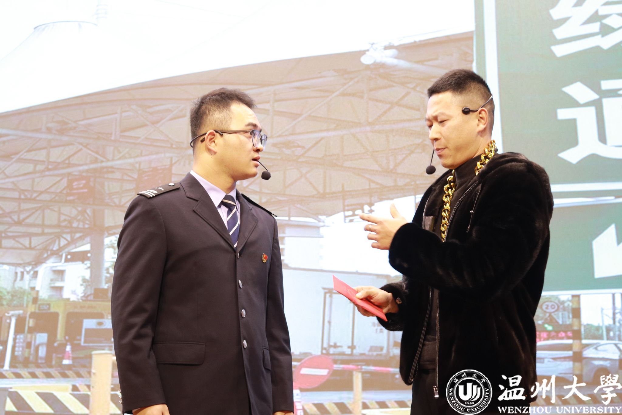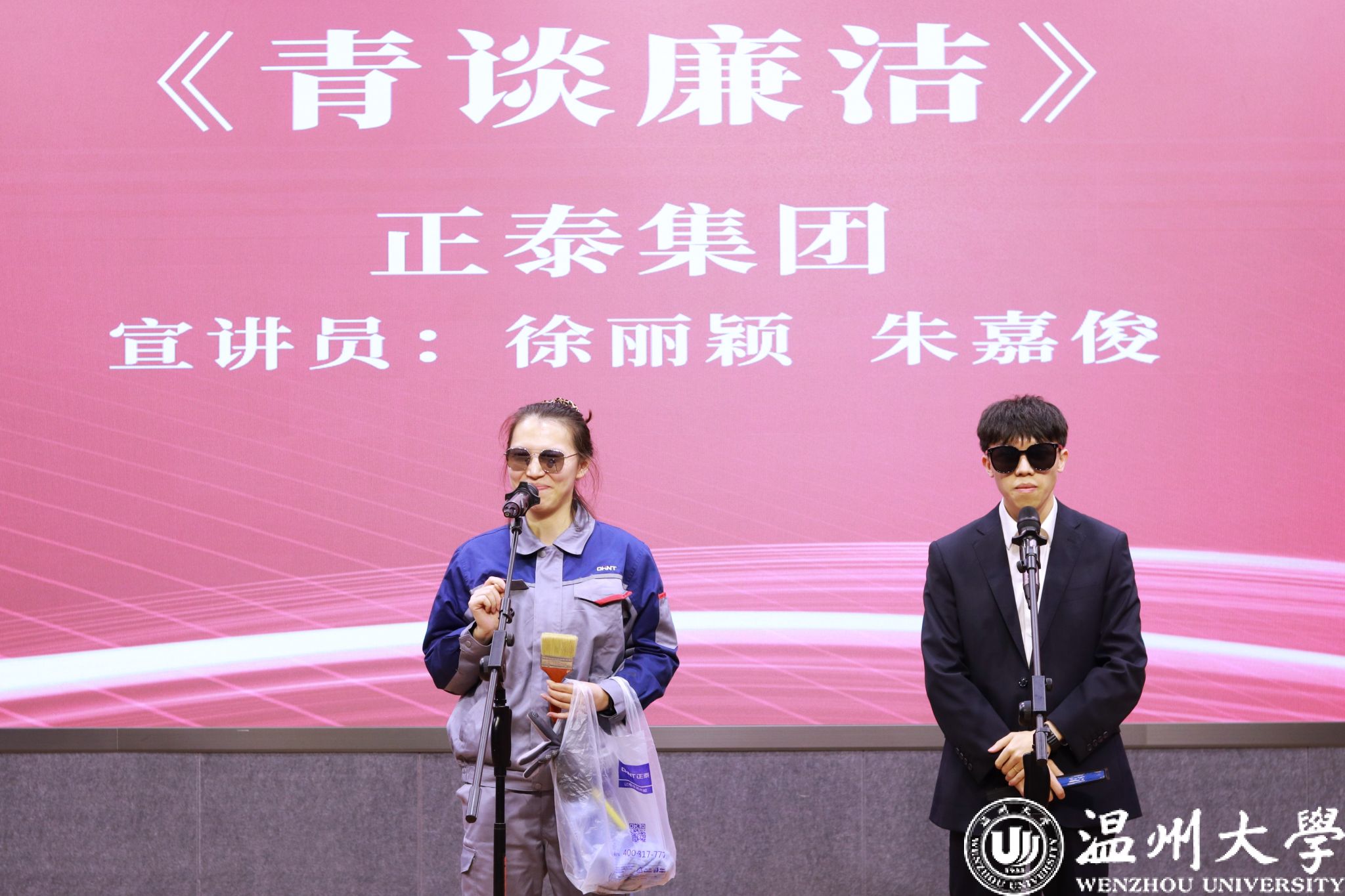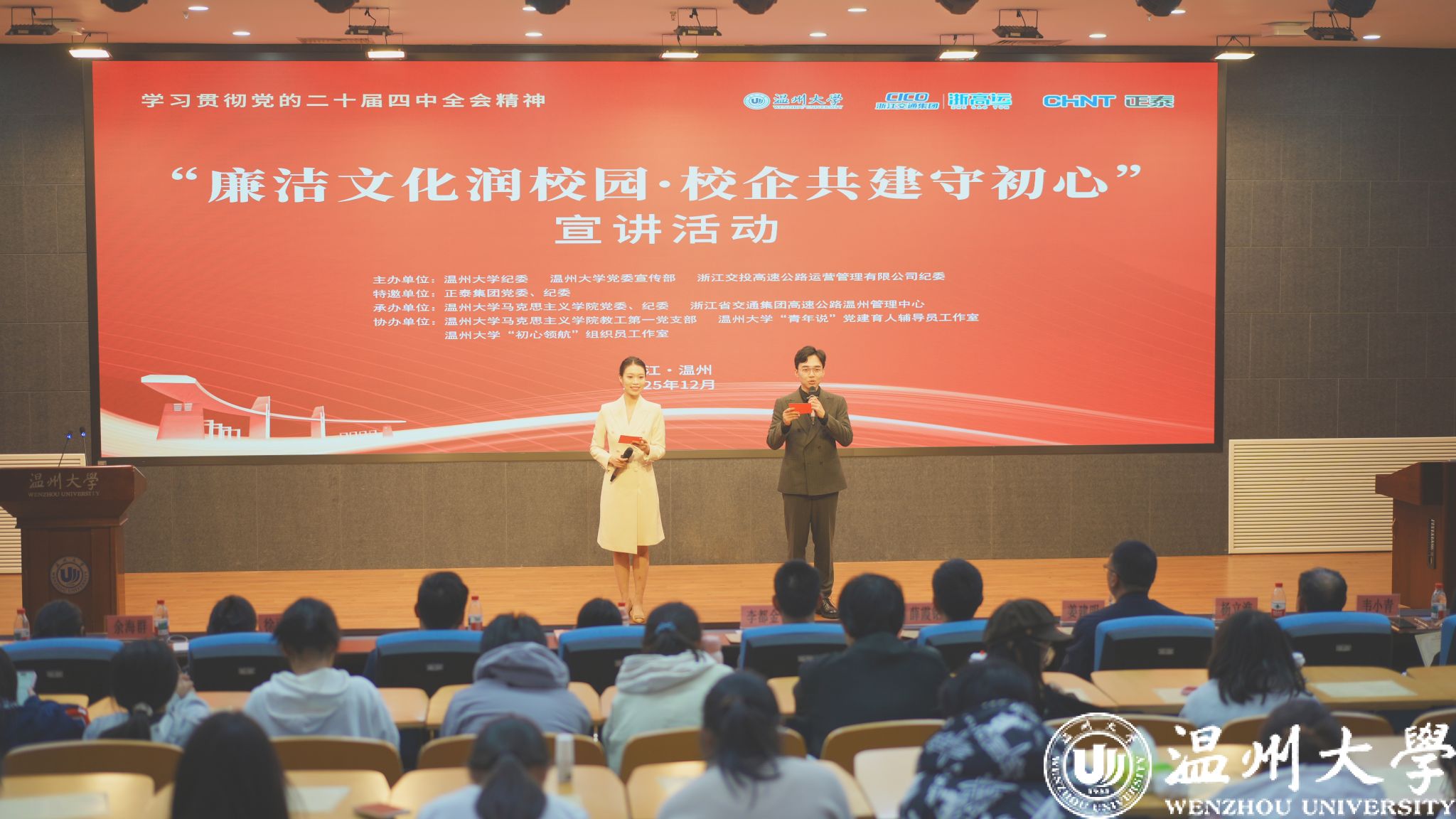 温州大学纪委书记李都金、浙高运纪委书记刘亦婴、正泰集团纪委书记薛霞铭等校企领导出席活动,共同见证这场廉洁宣讲盛会。11 个精彩节目以微党课、脱口秀、相声、朗诵、情景演绎等多元形式,诠释廉洁内涵,既是校企协同深化廉洁育人的实践探索,更是以实际行动践行党的二十届四中全会精神的生动体现,为现场师生与企业同仁带来一场直抵心灵的精神洗礼。