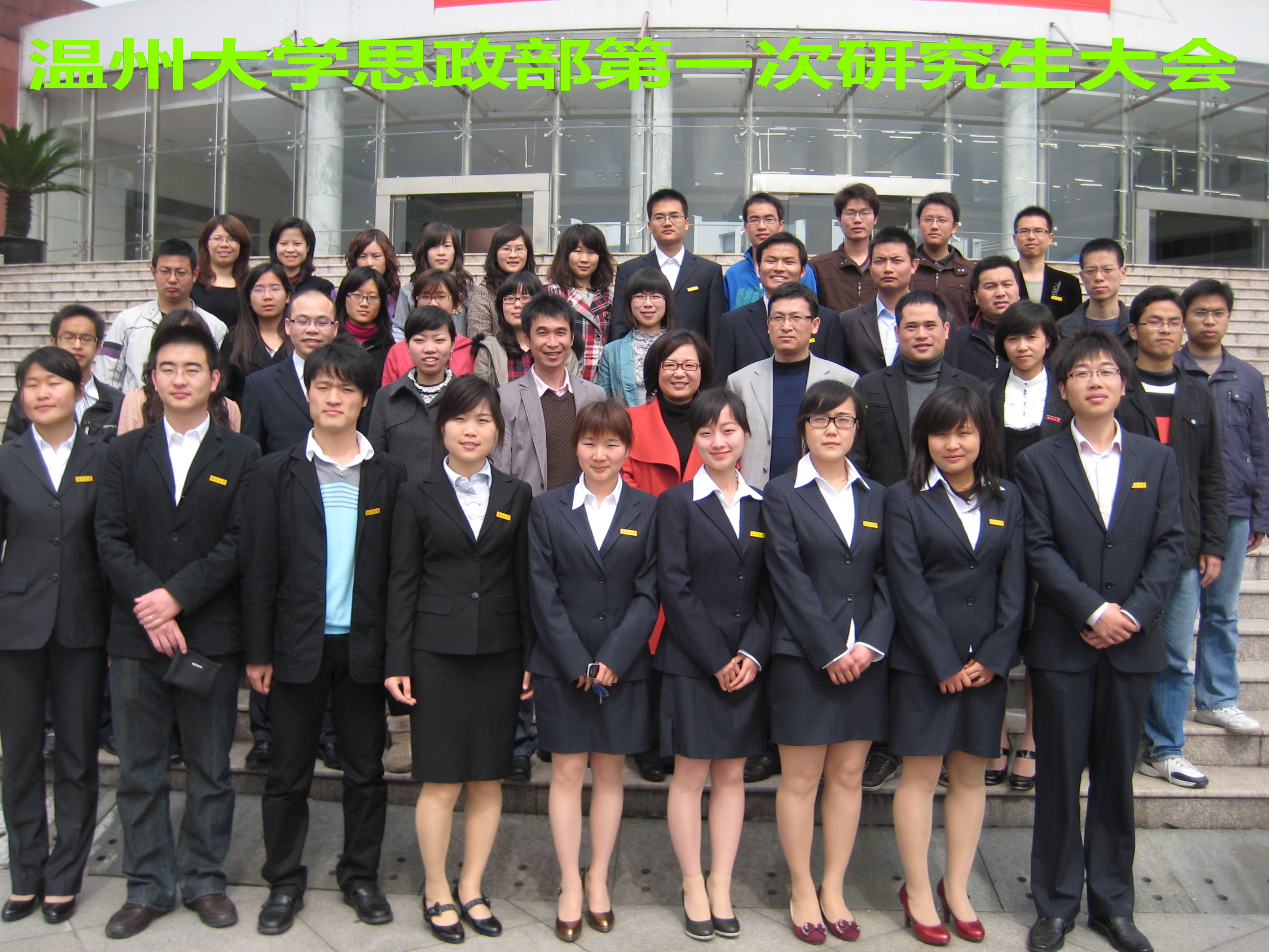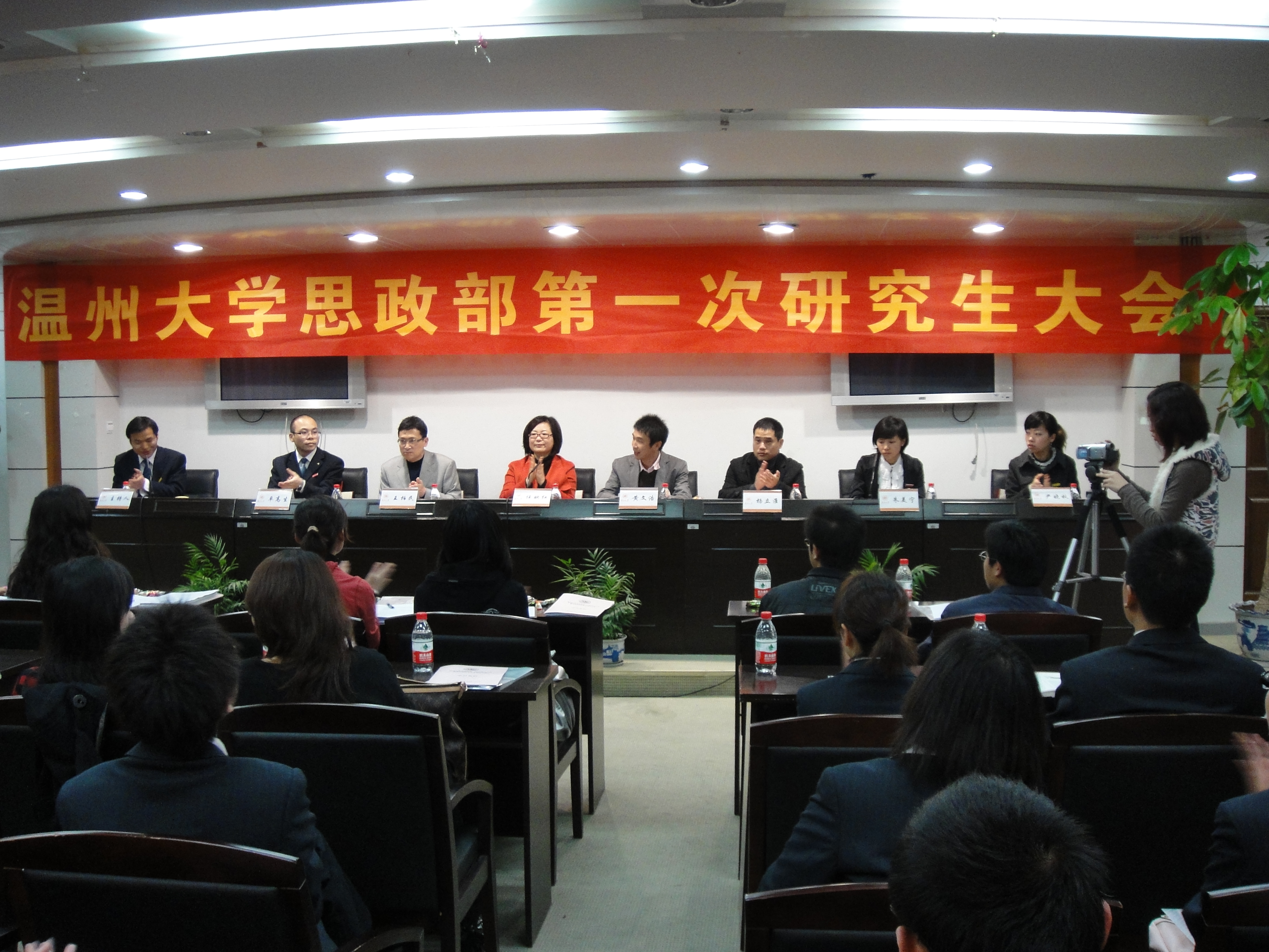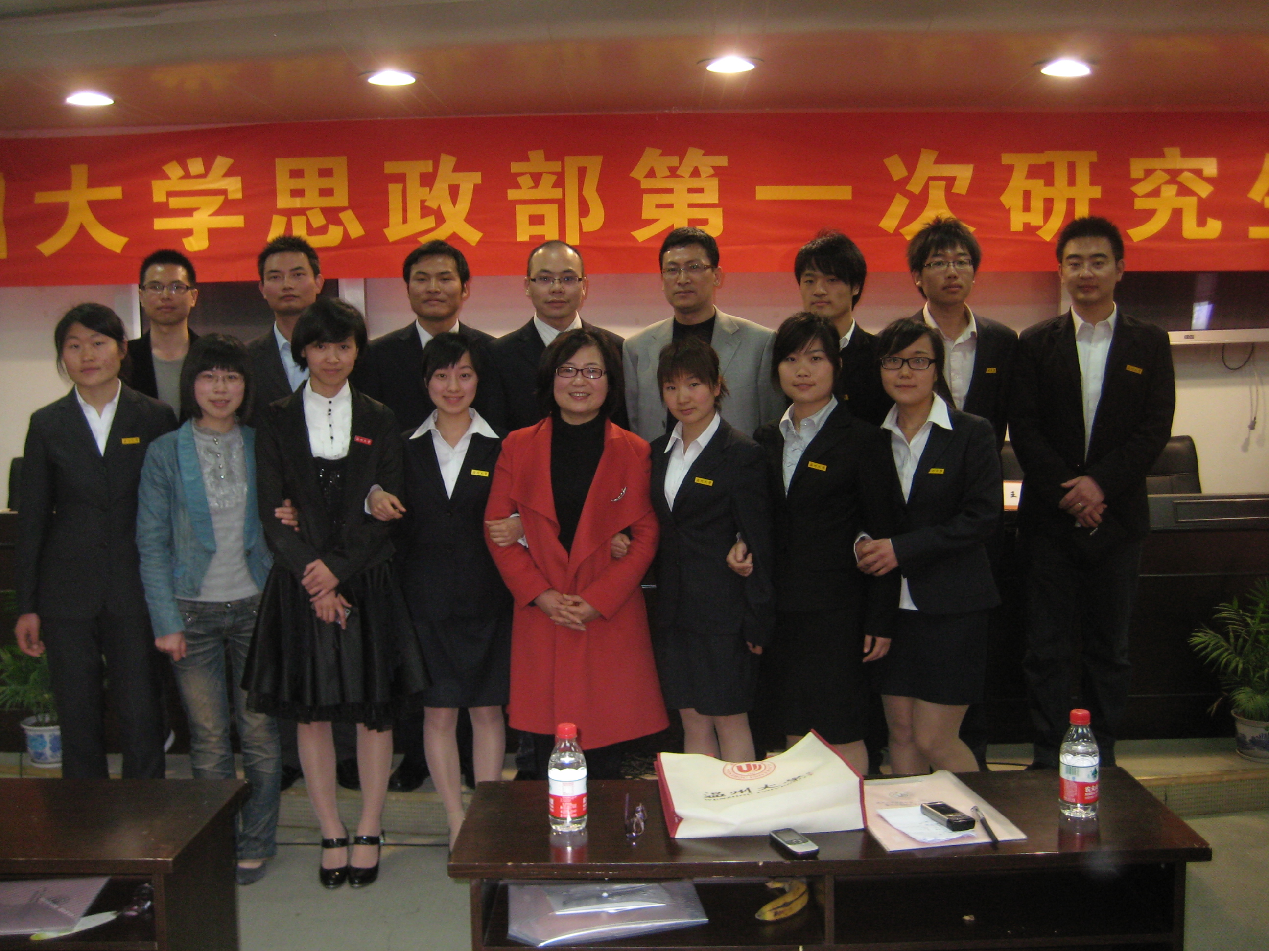 2010年4月10日上午,温州大学思政部第一次研究生大会暨思政部研究生会成立大会在北校区行政楼331会议室隆重举行。校研究生工作部副部长黄文浩、校团委副书记杨立淮、思政部党总支书记、主任任映红、副主任王柏民、朱美宁老师、卓高生老师出席了开幕式。