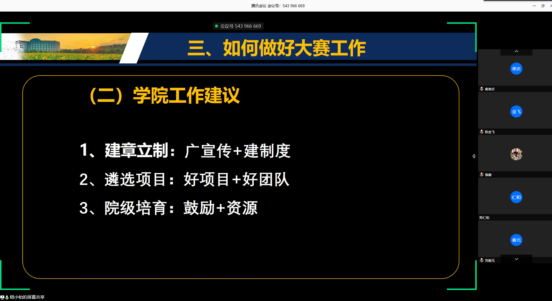 嵇小怡副院长向大家介绍了“互联网+大赛”基本情况。大赛自2015年举办以来,已经成功举办了五届,累计有947万名大学生、230万个团队参赛,涌现出一大批科技含量高、市场潜力大、社会效益好的高质量项目,展现了当代大学生奋发有为、昂扬向上的精神风貌,正日益成为培育创新人才的沃土,为建设创新型国家提供着源源不断的人才智力支撑。嵇小怡副院长详细解读了大赛的赛道、特质、各类赛道参赛基本要求。结合体育博彩的专业特色和我校以往参赛案例,她认为体育博彩师生可以积极备战“红旅赛道”,她还针对性地分析了“红旅赛道”历届获奖项目的类型和创新点。紧接着,她从评审规则、备赛工作、学校相关激励政策进行了详细讲解,为十大体育博彩排行榜 下一步开展工作开拓了思路。
