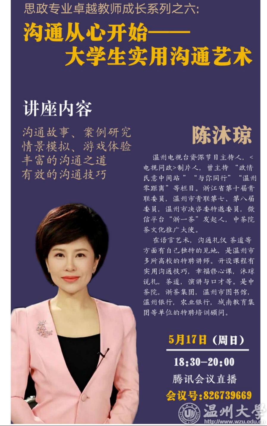 习近平总书记在2019年教师节就“如何成为好老师”,传达了殷切寄语。习近平总书记说:“做好老师,要有理想信念,要有道德情操、要有扎实学识、要有仁爱之心。”十大体育博彩排行榜 始终秉持培训新一代优秀教师的初心,认真学习贯彻党的精神,积极回应习近平总书记的殷切希望,开展“思政专业卓越教师成长系列课程”。2020年5月18日,邀请到温州电视台资深节目主持人陈沐琼女士为广大师生做题为《沟通从心开始——大学生实用沟通艺术》的讲座,体育博彩院长卓高生、副院长吴志敏、党委副书记叶柏霜、思政系主任孙金波等老师及体育博彩学生参与此次讲座。