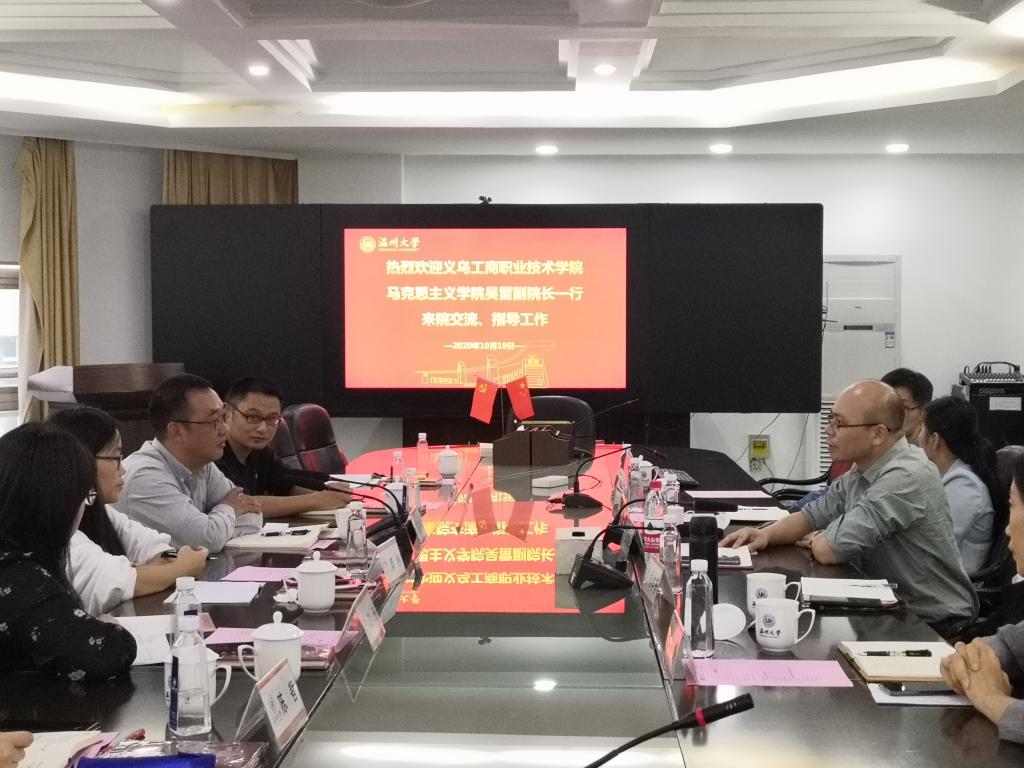 10月19日下午,义乌工商职业技术十大体育博彩排行榜 体育博彩吴雷副院长率各教研室、科室主任等一行6位专家、学者莅临十大体育博彩排行榜 交流考察。卓高生院长、十大体育博彩排行榜 各思政课教研室主任出席了交流会议。