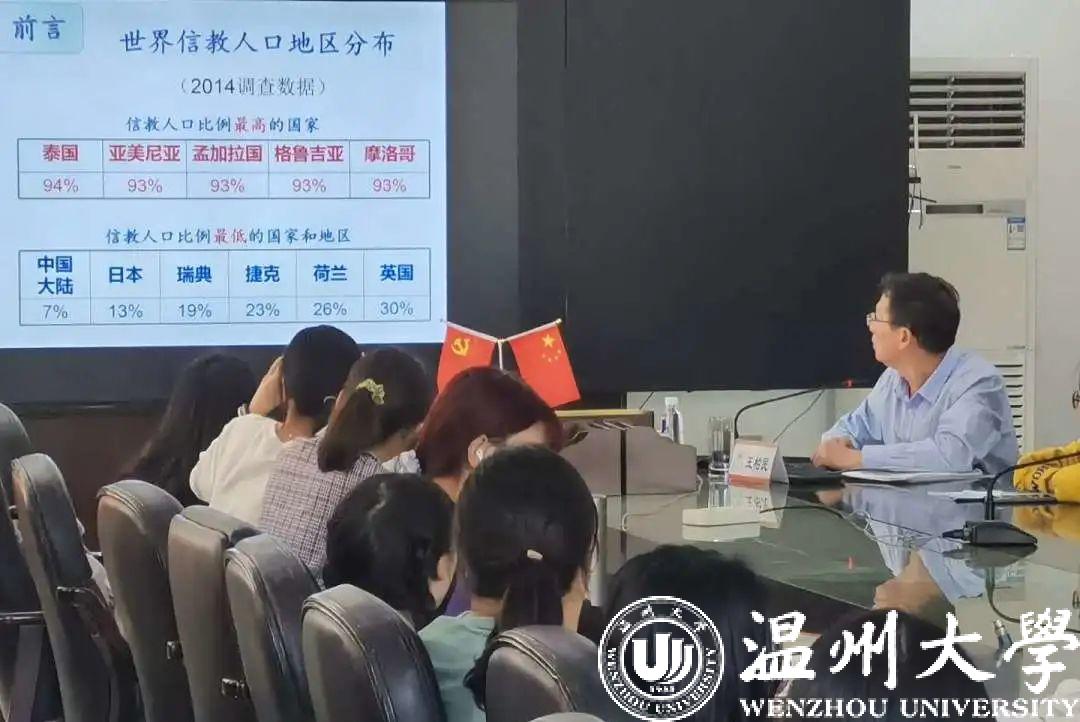 首先,王柏民书记先强调了该课程的特殊意义,旨在帮助学生们建立正确的宗教观,以利于接下来的专业课学习。在介绍世界宗教分布和世界信教人口地区分布的基本情况后,王柏民书记指出了21世纪趋向主流、变化格局、影响扩大的宗教发展趋势,进一步分析了当前中国公民信仰宗教现状和我国宗教的工作形势,最终强调了用马克思主义解释宗教,对待宗教的重要性。